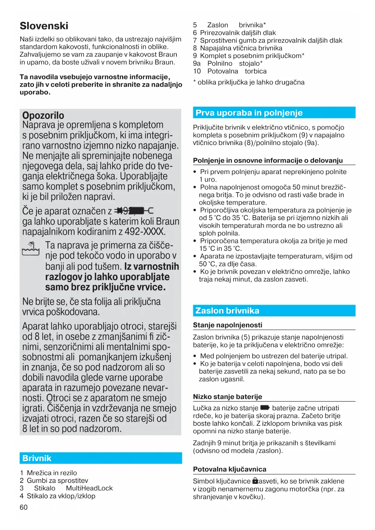 Uređaj se isključuje iako mu je baterija u potpunosti napunjena. Mrežica i blok noža su istrošeni pa uređaj troši više energije za svako brijanje. Uređaj se isključuje. – Zamijenite kazetu s mrežicom i blokom noža. – Redovito podmazujte brijaći sustav, pogotovo ako se uređaj čisti isključivo pod vodom.60 Slovenski Naši izdelki so oblikovani tako, da ustrezajo najvišjim standardom kakovosti, funkcionalnosti in oblike. Zahvaljujemo se vam za zaupanje v kakovost Braun in upamo, da boste uživali v novem brivniku Braun. Ta navodila vsebujejo varnostne informacije, zato jih v celoti preberite in shranite za nadaljnjo uporabo. Opozorilo Naprava je opremljena s kompletom s posebnim priključkom, ki ima integri- rano varnostno izjemno nizko napajanje. Ne menjajte ali spreminjajte nobenega njegovega dela, saj lahko pride do tve- ganja električnega šoka. Uporabljajte samo komplet s posebnim priključkom, ki je bil priložen napravi. Če je aparat označen z 492, ga lahko uporabljate s katerim koli Braun napajalnikom kodiranim z 492-XXXX. Ta naprava je primerna za čišče- nje pod tekočo vodo in uporabo v banji ali pod tušem. Iz varnostnih razlogov jo lahko uporabljate samo brez priključne vrvice. Ne brijte se, če sta folija ali priključna vrvica poškodovana. Aparat lahko uporabljajo otroci, starejši od 8 let, in osebe z zmanjšanimi fi zič- nimi, senzoričnimi ali mentalnimi spo- sobnostmi ali pomanjkanjem izkušenj in znanja, če so pod nadzorom ali so dobili navodila glede varne uporabe aparata in razumejo povezane nevar- nosti. Otroci se z aparatom ne smejo igrati. Čiščenja in vzdrževanja ne smejo izvajati otroci, razen če so starejši od 8 let in so pod nadzorom. Brivnik 1 Mrežica in rezilo 2 Gumbi za sprostitev 3 Stikalo MultiHeadLock 4 Stikalo za vklop/izklop 5 Zaslon brivnika* 6 Prirezovalnik daljših dlak 7 Sprostitveni gumb za prirezovalnik daljših dlak 8 Napajalna vtičnica brivnika 9 Komplet s posebnim priključkom* 9a Polnilno stojalo* 10 Potovalna torbica