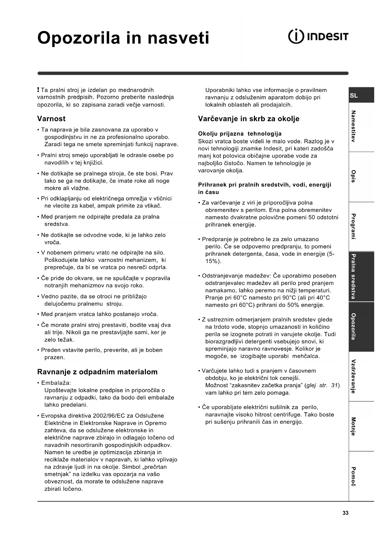 Opozorila in nasveti PomoèMotnjeOpozorila VzdrevanjeProgrami Pralna sredstvaNamestitev Opis Ta pralni stroj je izdelan po mednarodnih varnostnih predpisih. Pozorno preberite naslednja opozorila, ki so zapisana zaradi veèje varnosti. Varnost Ta naprava je bila zasnovana za uporabo v gospodinjstvu in ne za profesionalno uporabo. Zaradi tega ne smete spreminjati funkcij naprave. Pralni stroj smejo uporabljati le odrasle osebe po navodilih v tej knjiici. Ne dotikajte se pralnega stroja, èe ste bosi. Prav tako se ga ne dotikajte, èe imate roke ali noge mokre ali vlane. Pri odklapljanju od elektriènega omreja v vtiènici ne vlecite za kabel, ampak primite za vtikaè. Med pranjem ne odpirajte predala za pralna sredstva. Ne dotikajte se odvodne vode, ki je lahko zelo vroèa. V nobenem primeru vratc ne odpirajte na silo. Pokodujete lahko varnostni mehanizem, ki prepreèuje, da bi se vratca po nesreèi odprla. Èe pride do okvare, se ne spuèajte v popravila notranjih mehanizmov na svojo roko. Vedno pazite, da se otroci ne pribliajo delujoèemu pralnemu stroju. Med pranjem vratca lahko postanejo vroèa. Èe morate pralni stroj prestaviti, bodite vsaj dva ali trije. Nikoli ga ne prestavljajte sami, ker je zelo teak. Preden vstavite perilo, preverite, ali je boben prazen. Ravnanje z odpadnim materialom Embalaa: Upotevajte lokalne predpise in priporoèila o ravnanju z odpadki, tako da bodo deli embalae lahko predelani. Evropska direktiva 2002/96/EC za Odsluene Elektriène in Elektronske Naprave in Opremo zahteva, da se odsluene elektronske in elektriène naprave zbirajo in odlagajo loèeno od navadnih nesortiranih gospodinjskih odpadkov. Namen te uredbe je optimizacija zbiranja in reciklae materialov v napravah, ki lahko vplivajo na zdravje ljudi in na okolje. Simbol preèrtan smetnjak na izdelku vas opozarja na vao obveznost, da morate te odsluene naprave zbirati loèeno. Uporabniki lahko vse informacije o pravilnem ravnanju z odsluenim aparatom dobijo pri lokalnih oblasteh ali prodajalcih. Varèevanje in skrb za okolje Okolju prijazna tehnologija Skozi vratca boste videli le malo vode. Razlog je v novi tehnologiji znamke Indesit, pri kateri zadoèa manj kot polovica obièajne uporabe vode za najboljo èistoèo. Namen te tehnologije je varovanje okolja. Prihranek pri pralnih sredstvih, vodi, energiji in èasu Za varèevanje z viri je priporoèljiva polna obremenitev s perilom. Ena polna obremenitev namesto dvakratne poloviène pomeni 50 odstotni prihranek energije. Predpranje je potrebno le za zelo umazano perilo. Èe se odpovemo predpranju, to pomeni prihranek detergenta, èasa, vode in energije (5- 15%). Odstranjevanje madeev: Èe uporabimo poseben odstranjevalec madeev ali perilo pred pranjem namakamo, lahko peremo na niji temperaturi. Pranje pri 60°C namesto pri 90°C (ali pri 40°C namesto pri 60°C) prihrani do 50% energije. Z ustreznim odmerjanjem pralnih sredstev glede na trdoto vode, stopnjo umazanosti in kolièino perila se izognete potrati in varujete okolje. Tudi biorazgradljivi detergenti vsebujejo snovi, ki spreminjajo naravno ravnovesje. Kolikor je mogoèe, se izogibajte uporabi mehèalca. Varèujete lahko tudi s pranjem v èasovnem obdobju, ko je elektrièni tok ceneji. Monost zakasnitev zaèetka pranja (glej str. 31) vam lahko pri tem zelo pomaga. Èe uporabljate elektrièni suilnik za perilo, naravnajte visoko hitrost centrifuge. Tako boste pri suenju prihranili èas in energijo.34
