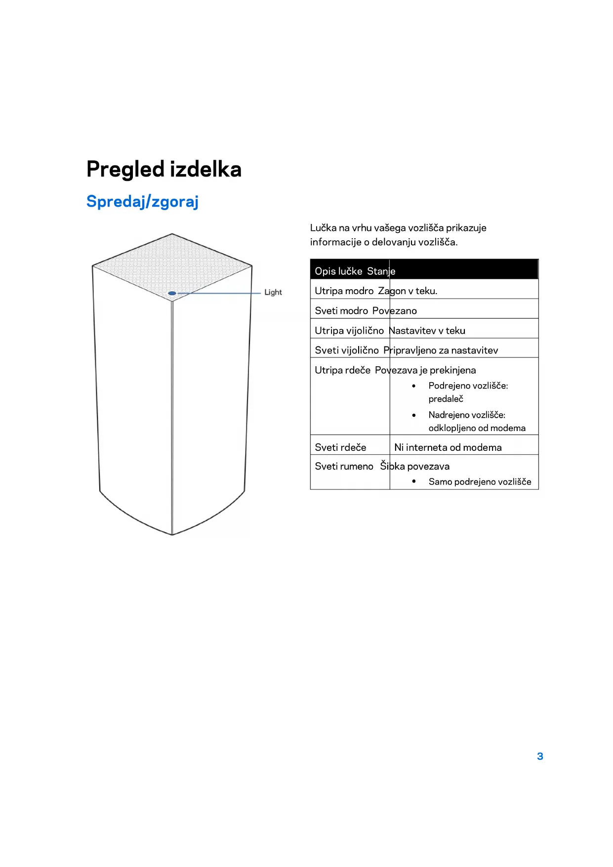 Gumb za ponastavitev — pritisnite in zadržite gumb, dokler lučka na vrhu vozlišča ne zasveti rdeče, ugasne in ponovno začne utripati rdeče. Tako se vozlišče ponastavi na tovarniško privzete nastavitve. Gumb Wi-Fi Protected Setup — pritisnite, da povežete omrežne naprave, omogočene za WPS. Stikalo za vklop— potisnite na | (vklop), da vklopite vozlišče.6 Pomoč Iskanje dodatne pomoči