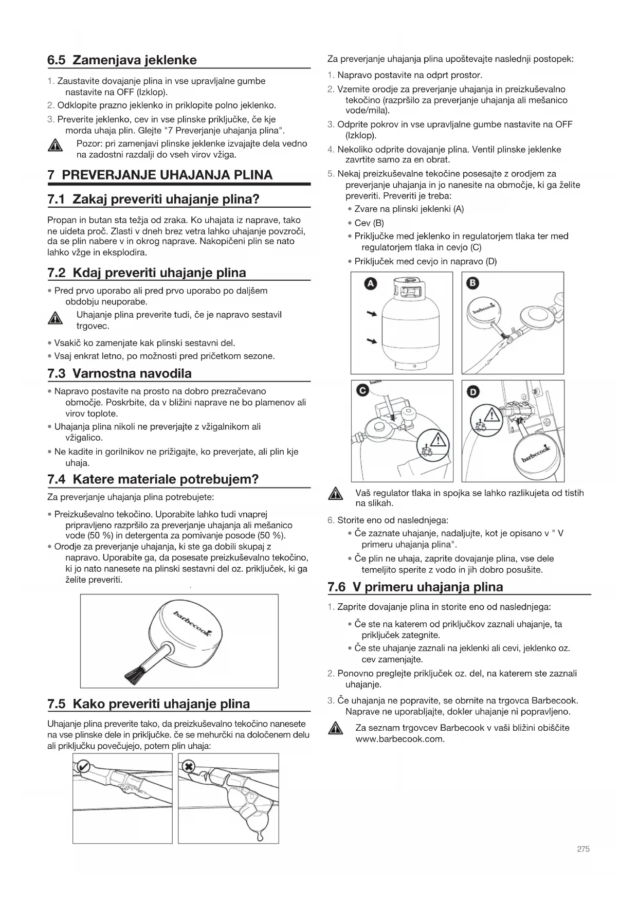 Naprave ne uporabljajte, dokler uhajanje ni popravljeno. Za seznam trgovcev Barbecook v vaši bližini obiščite www.barbecook.com.276