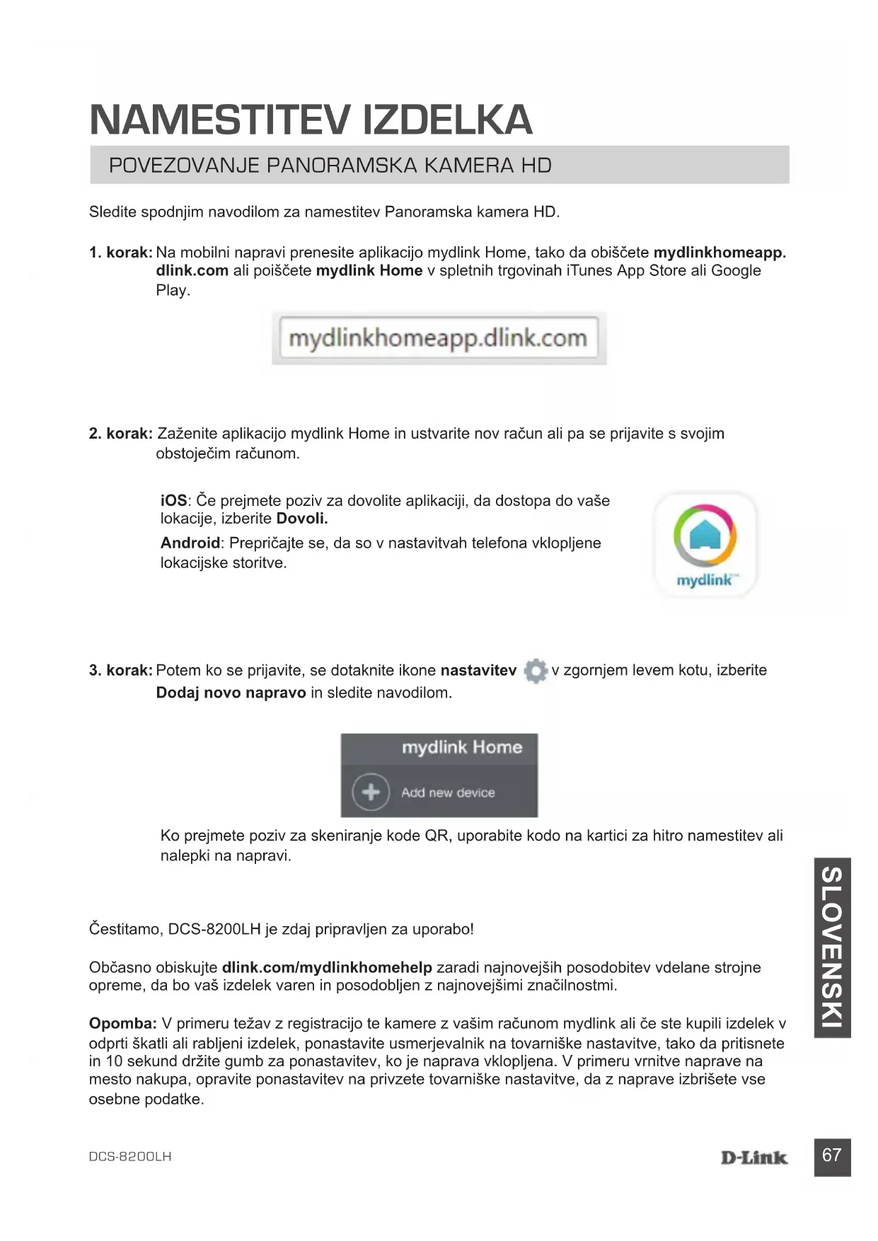 SLOVENSKI Čestitamo, DCS-8200LH je zdaj pripravljen za uporabo! Občasno obiskujte dlink.com/mydlinkhomehelp zaradi najnovejših posodobitev vdelane strojne opreme, da bo vaš izdelek varen in posodobljen z najnovejšimi značilnostmi. Opomba: V primeru težav z registracijo te kamere z vašim računom mydlink ali če ste kupili izdelek v odprti škatli ali rabljeni izdelek, ponastavite usmerjevalnik na tovarniške nastavitve, tako da pritisnete in 10 sekund držite gumb za ponastavitev, ko je naprava vklopljena. V primeru vrnitve naprave na mesto nakupa, opravite ponastavitev na privzete tovarniške nastavitve, da z naprave izbrišete vse osebne podatke. Sledite spodnjim navodilom za namestitev Panoramska kamera HD.
