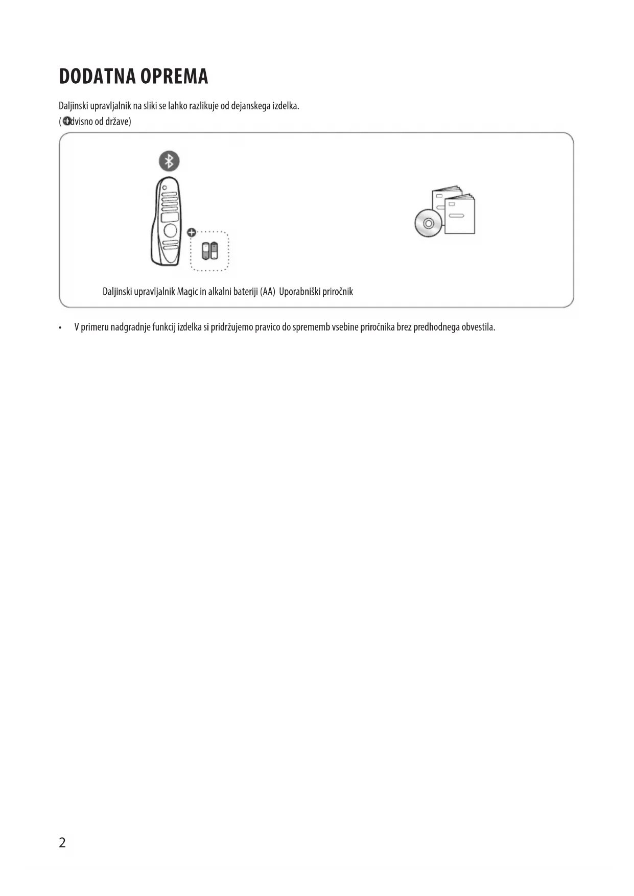www.lg.com Copyright © 2020 LG Electronics Inc. Vse pravice pridržane.2 DODATNA OPREMA Daljinski upravljalnik na sliki se lahko razlikuje od dejanskega izdelka. ( Odvisno od države) Daljinski upravljalnik Magic in alkalni bateriji (AA) Uporabniški priročnik