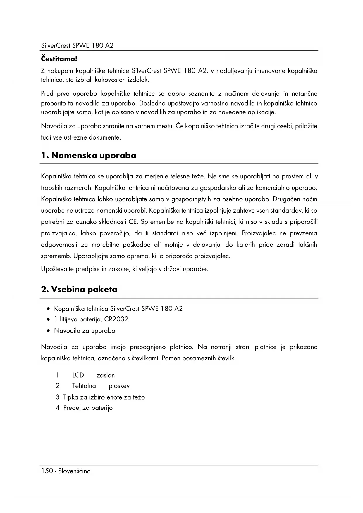- Navodila za uporabo Navodila za uporabo imajo prepognjeno platnico. Na notranji strani platnice je prikazana kopalniška tehtnica, označena s številkami. Pomen posameznih številk: 1 LCD zaslon 2 Tehtalna ploskev 3 Tipka za izbiro enote za težo 4 Predel za baterijoSilverCrest SPWE 180 A2 Slovenščina - 151