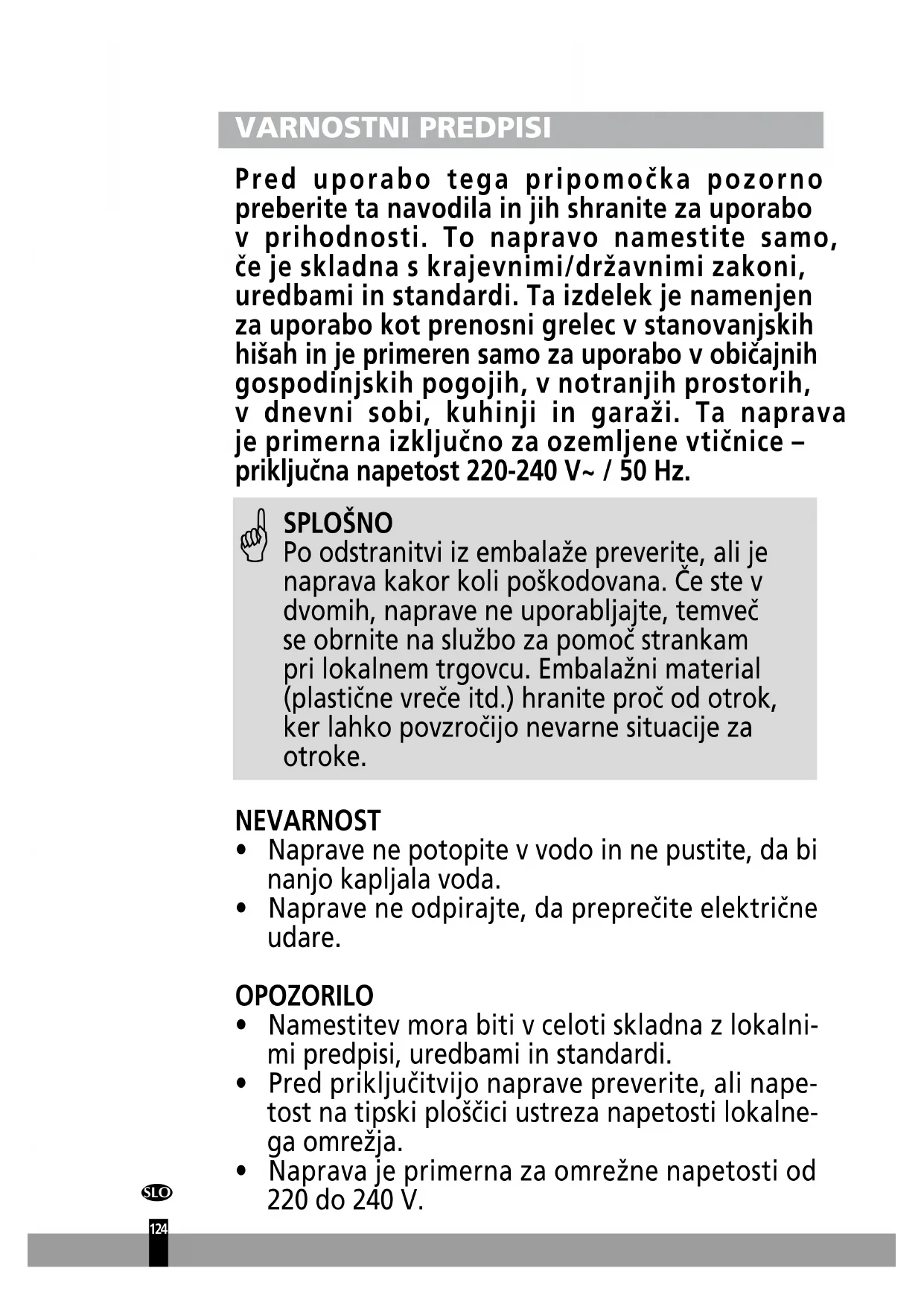 SPLOŠNO Po odstranitvi iz embalaže preverite, ali je naprava kakor koli poškodovana. Če ste v dvomih, naprave ne uporabljajte, temveč se obrnite na službo za pomoč strankam pri lokalnem trgovcu. Embalažni material (plastične vreče itd.) hranite proč od otrok, ker lahko povzročijo nevarne situacije za otroke.125