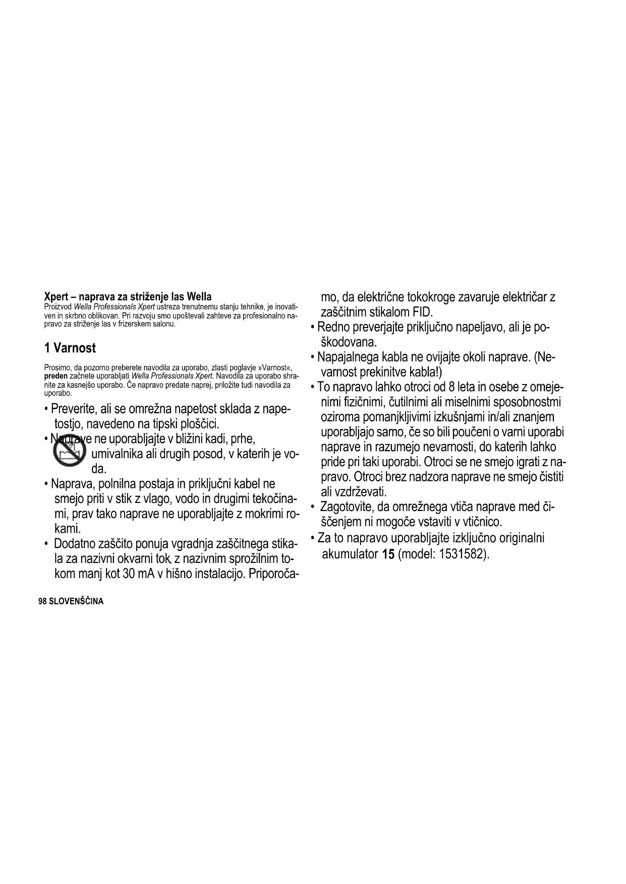 Litij-ion U24_Wella_Xpert.book Seite 96 Mittwoch, 29. Oktober 2014 4:07 0497HRVATSKI U24_Wella_Xpert.book Seite 97 Mittwoch, 29. Oktober 2014 4:07 0498 SLOVENŠČINA Xpert – naprava za striženje las Wella Proizvod Wella Professionals Xpert ustreza trenutnemu stanju tehnike, je inovati- ven in skrbno oblikovan. Pri razvoju smo upoštevali zahteve za profesionalno na- pravo za striženje las v frizerskem salonu. 1 Varnost Prosimo, da pozorno preberete navodila za uporabo, zlasti poglavje »Varnost«, preden začnete uporabljati Wella Professionals Xpert. Navodila za uporabo shra- nite za kasnejšo uporabo. Če napravo predate naprej, priložite tudi navodila za uporabo.