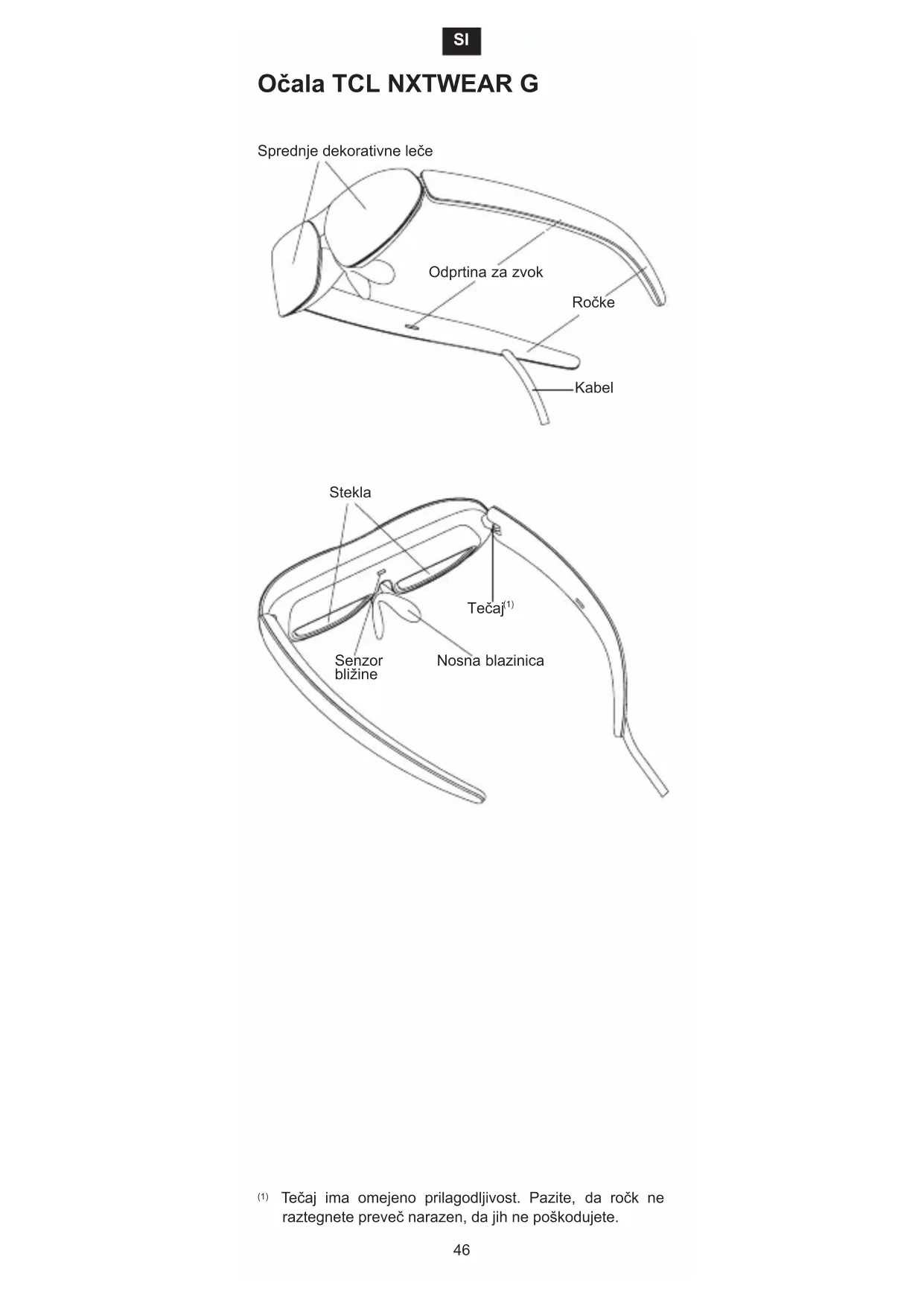 - Pred natikanjem očal se prepričajte, da so ročke popolnoma razprte, da se z njimi ne uščipnete v roke ali si jih zataknete med lase. Opozorilo Pred uporabo očal TCL NXTWEAR G obvezno preberite celoten uporabniški priročnik, da se seznanite s funkcijami tega izdelka. Če tega izdelka ne uporabljate varno in odgovorno in za predviden namenu, se lahko poškodujete ali poškodujete izdelek ali drugo lastnino. Ta izdelek ni namenjen otrokom, mlajšim od 14 let, brez neposrednega nadzora odraslih. Omejitev odgovornosti Čestitamo vam za nakup naših očal TCL NXTWEAR G. Obstajajo lahko določene razlike med opisom v uporabniškem priročniku in delovanjem telefona, kar je odvisno od različice programske opreme telefona in očal oziroma določenih nastavitev operaterja. Podjetje TCL Communication Ltd. za take razlike pravno ni odgovorno. Varnostne informacije ZA ZMANJŠANJE TVEGANJA TELESNIH POŠKODB, NEPRIJETNOSTI ALI MATERIALNE ŠKODE, PROSIMO, DA PRED UPORABO NAŠIH OČAL TCL NXTWEAR G PREBERETE NASLEDNJE VARNOSTNE INFORMACIJE. Izdelek uporabljajte le v varnem okolju. Da se izognete poškodbam sluha, ne poslušajte glasne glasbe dlje časa. Teh očal ne uporabljajte med nenadnimi ali intenzivnimi aktivnostmi. Če so vaša očala vroča na dotik ali so neprijetno topla, jih prenehajte uporabljati in pustite, da se ohladijo. Če čutite, da imate utrujene oči ali omotico, takoj prenehajte uporabljati očala. Če so očala poškodovana, jih takoj prenehajte uporabljati. Očal ne izpostavljajte tekočini. Pred uporabo teh očal se posvetujte s svojim zdravnikom. Ne uporabljajte teh očal, če ste bolni, utrujeni, pod vplivom opojnih drog/zdravil ali se na splošno ne počutite dobro. Med uporabo očal ne stiskajte, da se izognete poškodbam očal ali izpadanju leč, saj bi to lahko poškodovalo obraz uporabnika'.50