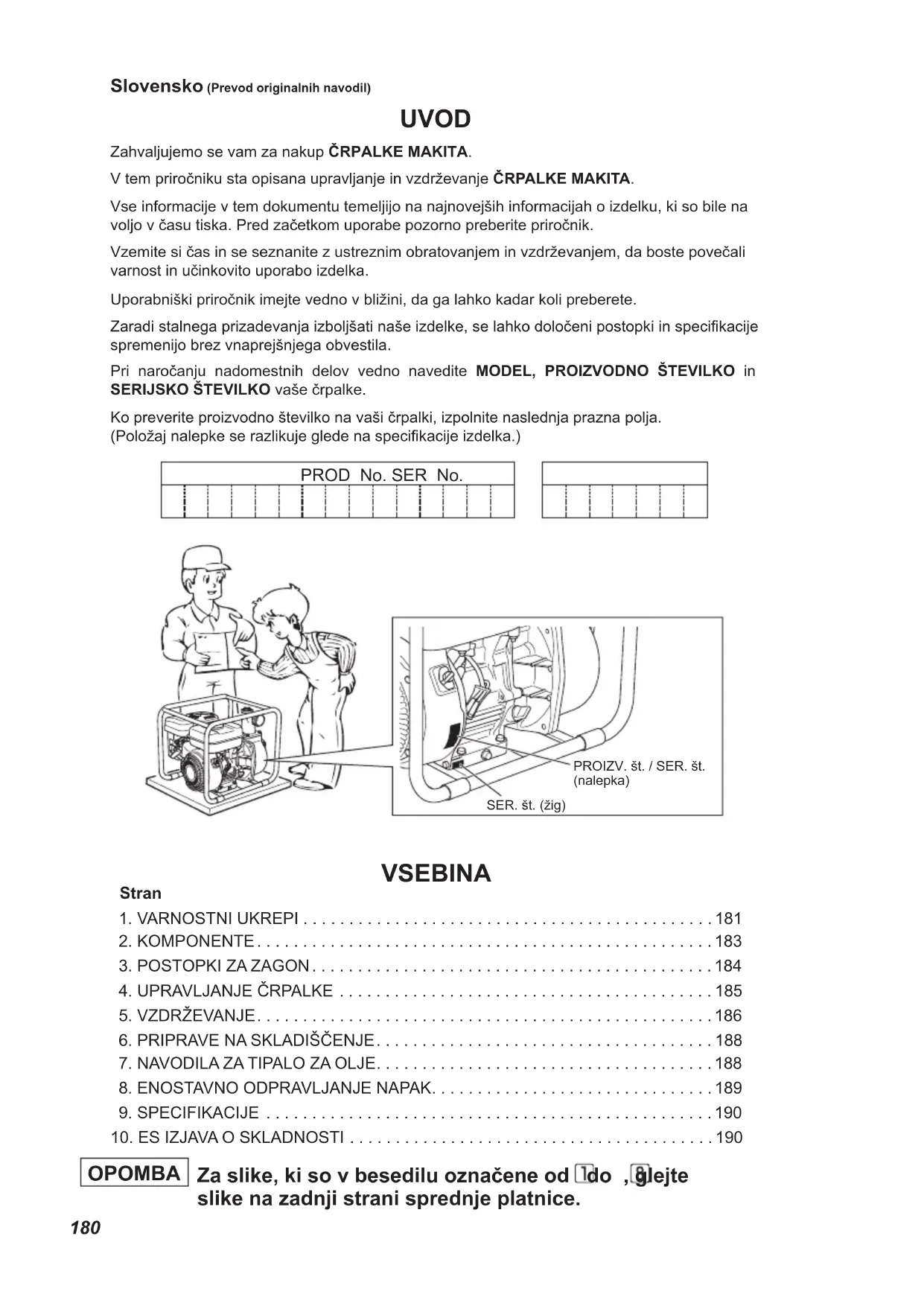 Značka Naměřená hladina akustického výkonu Zaručená hladina akustického výkonu EW2050H 100 dB(A) 101 dB(A) EW3050H 103 dB(A) 103 dB(A) EW2051H 101 dB(A) 103 dB(A) EW3051H 104 dB(A) 105 dB(A) Tyto úrovně hluku nemusí nezbytně znázorňovat bezpečnou pracovní úroveň. Uživatel však může prostřednictvím těchto informací lépe posoudit nebezpečí a rizika. Poznámka: Úroveň hluku se mění na základě technických údajů. Technické údaje se mohou změnit bez předchozího upozornění.180 UVOD Zahvaljujemo se vam za nakup ČRPALKE MAKITA. V tem priročniku sta opisana upravljanje in vzdrževanje ČRPALKE MAKITA. Vse informacije v tem dokumentu temeljijo na najnovejših informacijah o izdelku, ki so bile na voljo v času tiska. Pred začetkom uporabe pozorno preberite priročnik.Vzemite si čas in se seznanite z ustreznim obratovanjem in vzdrževanjem, da boste povečali varnost in učinkovito uporabo izdelka.Uporabniški priročnik imejte vedno v bližini, da ga lahko kadar koli preberete.Zaradi stalnega prizadevanja izboljšati naše izdelke, se lahko določeni postopki in specikacije spremenijo brez vnaprejšnjega obvestila.Pri naročanju nadomestnih delov vedno navedite MODEL, PROIZVODNO ŠTEVILKO in SERIJSKO ŠTEVILKO vaše črpalke.Ko preverite proizvodno številko na vaši črpalki, izpolnite naslednja prazna polja. (Položaj nalepke se razlikuje glede na specikacije izdelka.) PROD No. SER No. PROIZV. št. / SER. št.(nalepka)SER. št. (žig) Za slike, ki so v besedilu označene od do , glejte slike na zadnji strani sprednje platnice. OPOMBA VSEBINA Stran