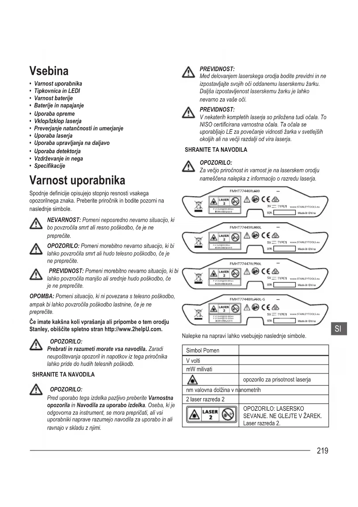 - Preverjanje umerjenosti in ostala vzdrževalna popravila lahko opravijo servisni centri STANLEY.229