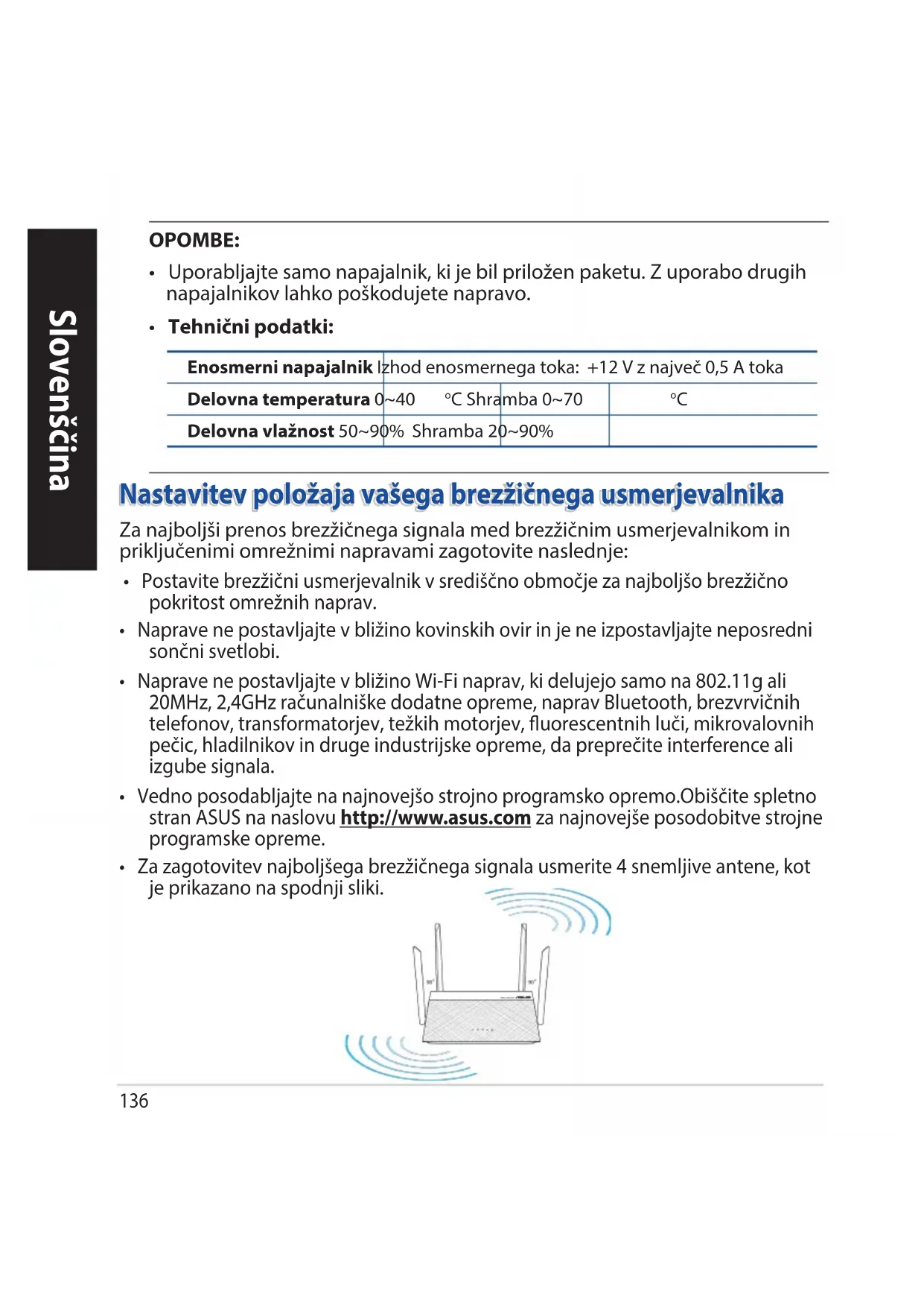 - Používateľskúpríručkumôžetezískaťon-linena https://www.asus.com/support135 Slovenščina Hiter pogled na vaš RT-N19 Vsebina paketa RT-N19 Adapter za izmenični tok Omrežni kabel (RJ-45) Vodnik za hitri zagon Lučka za vklop Stikalo za vklop/izklop LAN lučke LED Vhod za napajanje (DC-IN) WAN (internet) lučka LED Gumb za WPS Lučka 2,4GHz Vhod WAN (Internet) Gumb za ponastavitev Vhodi LAN 1~2 Slovenščina136 Slovenščina Nastavitev položaja vašega brezžičnega usmerjevalnika Za najboljši prenos brezžičnega signala med brezžičnim usmerjevalnikom in priključenimi omrežnimi napravami zagotovite naslednje: