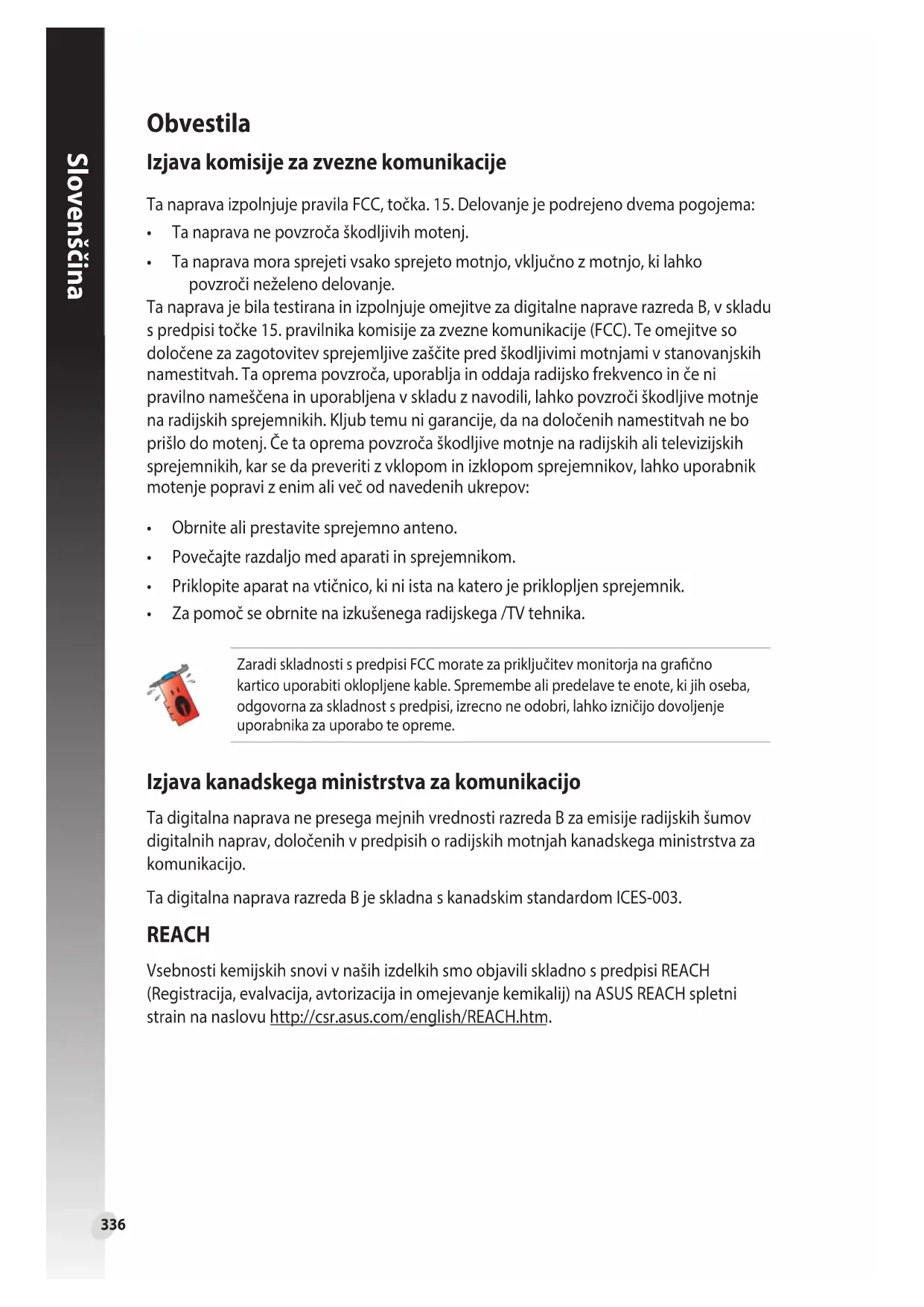 - Zapomočseobrnitenaizkušenegaradijskega/TVtehnika. Izjava kanadskega ministrstva za komunikacijo Ta digitalna naprava ne presega mejnih vrednosti razreda B za emisije radijskih šumov digitalnih naprav, določenih v predpisih o radijskih motnjah kanadskega ministrstva za komunikacijo. Ta digitalna naprava razreda B je skladna s kanadskim standardom ICES-003. Zaradi skladnosti s predpisi FCC morate za priključitev monitorja na gračno kartico uporabiti oklopljene kable. Spremembe ali predelave te enote, ki jih oseba, odgovorna za skladnost s predpisi, izrecno ne odobri, lahko izničijo dovoljenje uporabnika za uporabo te opreme. REACH Vsebnosti kemijskih snovi v naših izdelkih smo objavili skladno s predpisi REACH (Registracija, evalvacija, avtorizacija in omejevanje kemikalij) na ASUS REACH spletni strain na naslovu http://csr.asus.com/english/REACH.htm.337 Slovenščina Varnostne informacije Električna varnost