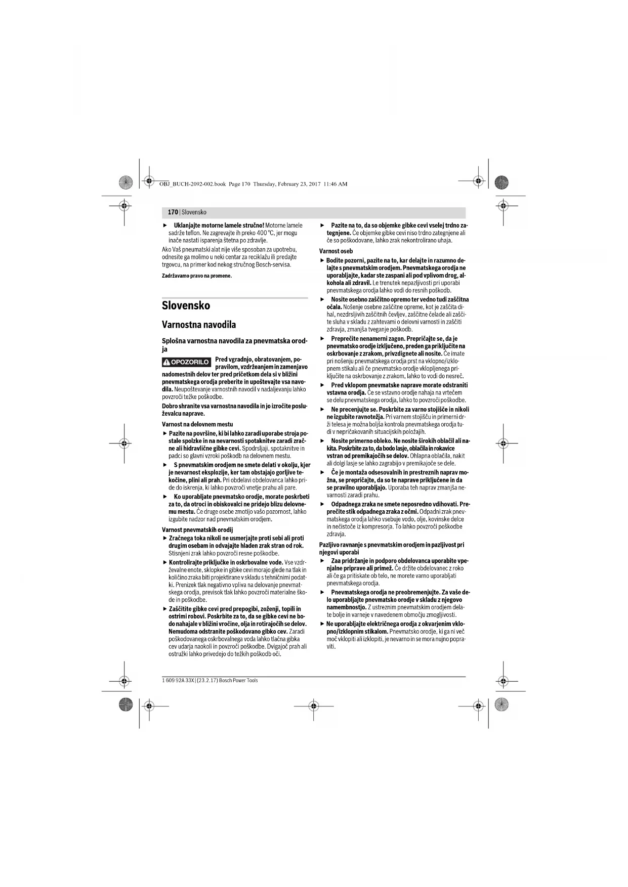 Pred vgradnjo, obratovanjem, po- pravilom, vzdržeanjem in zamenjavo nadomestnih delov ter pred pričetkom dela si v bližini pnevmatskega orodja preberite in upoštevajte vsa navo- dila. Neupoštevanje varnostnih navodil v nadaljevanju lahko povzroči težke poškodbe. Dobro shranite vsa varnostna navodila in jo izročite poslu- ževalcu naprave. Varnost na delovnem mestu Pazite na površine, ki bi lahko zaradi uporabe stroja po- stale spolzke in na nevarnosti spotaknitve zaradi zrač- ne ali hidravlične gibke cevi. Spodrsljaji, spotaknitve in padci so glavni vzroki poškodb na delovnem mestu. S pnevmatskim orodjem ne smete delati v okolju, kjer je nevarnost eksplozije, ker tam obstajajo gorljive te- kočine, plini ali prah. Pri obdelavi obdelovanca lahko pri- de do iskrenja, ki lahko povzroči vnetje prahu ali pare. Ko uporabljate pnevmatsko orodje, morate poskrbeti za to, da otroci in obiskovalci ne pridejo blizu delovne- mu mestu. Če druge osebe zmotijo vašo pozornost, lahko izgubite nadzor nad pnevmatskim orodjem. Varnost pnevmatskih orodij Zračnega toka nikoli ne usmerjajte proti sebi ali proti drugim osebam in odvajajte hladen zrak stran od rok. Stisnjeni zrak lahko povzroči resne poškodbe. Kontrolirajte priključke in oskrbovalne vode. Vse vzdr- ževalne enote, sklopke in gibke cevi morajo glede na tlak in količino zraka biti projektirane v skladu s tehničnimi podat- ki. Prenizek tlak negativno vpliva na delovanje pnevmat- skega orodja, previsok tlak lahko povzroči materialne ško- de in poškodbe. Zaščitite gibke cevi pred prepogibi, zoženji, topili in ostrimi robovi. Poskrbite za to, da se gibke cevi ne bo- do nahajale v bližini vročine, olja in rotirajočih se delov. Nemudoma odstranite poškodovano gibko cev. Zaradi poškodovanega oskrbovalnega voda lahko tlačna gibka cev udarja naokoli in povzroči poškodbe. Dvigajoč prah ali ostružki lahko privedejo do težkih poškodb oči. Pazite na to, da so objemke gibke cevi vselej trdno za- tegnjene. Če objemke gibke cevi niso trdno zategnjene ali če so poškodovane, lahko zrak nekontrolirano uhaja. Varnost oseb Bodite pozorni, pazite na to, kar delajte in razumno de- lajte s pnevmatskim orodjem. Pnevmatskega orodja ne uporabljajte, kadar ste zaspani ali pod vplivom drog, al- kohola ali zdravil. Le trenutek nepazljivosti pri uporabi pnevmatskega orodja lahko vodi do resnih poškodb. Nosite osebno zaščitno opremo ter vedno tudi zaščitna očala. Nošenje osebne zaščitne opreme, kot je zaščita di- hal, nezdrsljivih zaščitnih čevljev, zaščitne čelade ali zašči- te sluha v skladu z zahtevami o delovni varnosti in zaščiti zdravja, zmanjša tveganje poškodb. Preprečite nenamerni zagon. Prepričajte se, da je pnevmatsko orodje izključeno, preden ga priključite na oskrbovanje z zrakom, privzdignete ali nosite. Če imate pri nošenju pnevmatskega orodja prst na vklopno/izklo- pnem stikalu ali če pnevmatsko orodje vklopljenega pri- ključite na oskrbovanje z zrakom, lahko to vodi do nesreč. Pred vklopom pnevmatske naprave morate odstraniti vstavna orodja. Če se vstavno orodje nahaja na vrtečem se delu pnevmatskega orodja, lahko to povzroči poškodbe. Ne precenjujte se. Poskrbite za varno stojišče in nikoli ne izgubite ravnotežja. Pri varnem stojišču in primerni dr- ži telesa je možna boljša kontrola pnevmatskega orodja tu- di v nepričakovanih situacijskih položajih. Nosite primerno obleko. Ne nosite širokih oblačil ali na- kita. Poskrbite za to, da bodo lasje, oblačila in rokavice vstran od premikajočih se delov. Ohlapna oblačila, nakit ali dolgi lasje se lahko zagrabijo v premikajoče se dele. Če je montaža odsesovalnih in prestreznih naprav mo- žna, se prepričajte, da so te naprave priključene in da se pravilno uporabljajo. Uporaba teh naprav zmanjša ne- varnosti zaradi prahu. Odpadnega zraka ne smete neposredno vdihovati. Pre- prečite stik odpadnega zraka z očmi. Odpadni zrak pnev- matskega orodja lahko vsebuje vodo, olje, kovinske delce in nečistoče iz kompresorja. To lahko povzroči poškodbe zdravja. Pazljivo ravnanje s pnevmatskim orodjem in pazljivost pri njegovi uporabi Zaa pridržanje in podporo obdelovanca uporabite vpe- njalne priprave ali primež. Če držite obdelovanec z roko ali če ga pritiskate ob telo, ne morete varno uporabljati pnevmatskega orodja. Pnevmatskega orodja ne preobremenjujte. Za vaše de- lo uporabljajte pnevmatsko orodje v skladu z njegovo namembnostjo. Z ustreznim pnevmatskim orodjem dela- te bolje in varneje v navedenem območju zmogljivosti. Ne uporabljajte električnega orodja z okvarjenim vklo- pno/izklopnim stikalom. Pnevmatsko orodje, ki ga ni več moč vklopiti ali izklopiti, je nevarno in se mora nujno popra- viti. OPOZORILO OBJ_BUCH-2092-002.book Page 170 Thursday, February 23, 2017 11:46 AMSlovensko | 171 Bosch Power Tools 1 609 92A 33X | (23.2.17) Pred nastavitvijo naprave, zamenjavo delov pribora ali če naprave dlje časa ne uporabljate, morate prekiniti oskrbo z zrakom. Ta previdnostni ukrep onemogoča ne- namerni zagon pnevmatskega orodja. Pnevmatska orodja, ki niso v uporabi, morate hraniti izven dosega otrok. Ne dovolite, da bi pnevmatsko orodje uporabljale osebe, ki niso vešče uporabe ali ki niso prebrale teh navodil. Pnevmatska orodja so nevar- na, če jih uporabljajo neizkušene osebe. Pnevmatsko orodje skrbno negujte. Kontrolirajte, ali premikajoči se deli naprave brezhibno delujejo in niso zataknjeni, ali če so deli zlomljeni ali poškodovani tako, da bi to okrnilo funkcijo pnevmatskega orodja. Pred uporabo pnevmatskega orodja poskrbite za to, da se poškodovani deli popravijo. Mnogo nesreč se pripeti za- radi slabo vzdrževanih pnevmatskih orodij. Poskbite za to, da bodo rezalna orodja ostra in čista. Skrbno negovana rezalna orodja z ostrimi robovi rezil se redkeje zataknejo in so lažje vodljiva. Pnevmatsko orodje, pribor, vstavna orodja itd. upora- bljajte v skladu s temi navodili. Pri tem upoštevajte de- lov