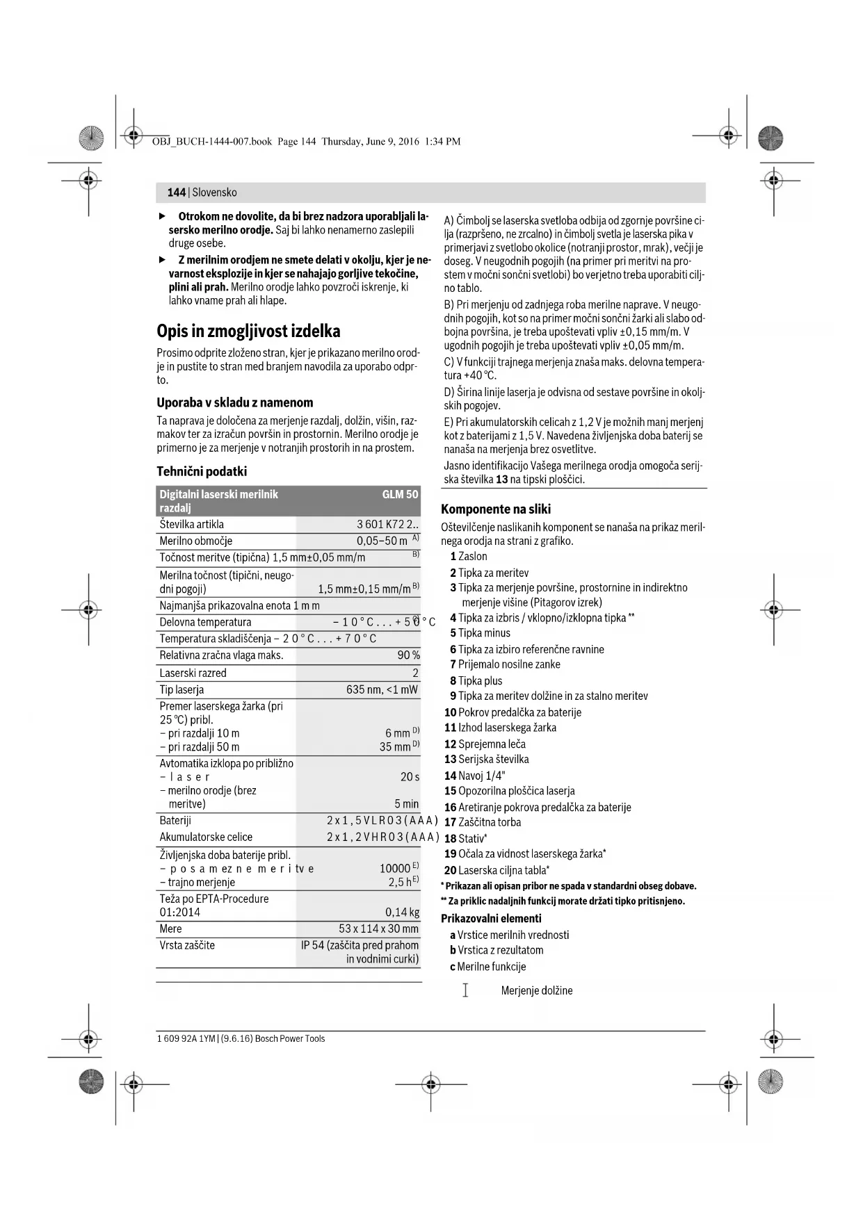 OBJ_BUCH-1444-007.book Page 143 Thursday, June 9, 2016 1:34 PM144 | Slovensko 1 609 92A 1YM | (9.6.16) Bosch Power Tools Otrokom ne dovolite, da bi brez nadzora uporabljali la- sersko merilno orodje. Saj bi lahko nenamerno zaslepili druge osebe. Z merilnim orodjem ne smete delati v okolju, kjer je ne- varnost eksplozije in kjer se nahajajo gorljive tekočine, plini ali prah. Merilno orodje lahko povzroči iskrenje, ki lahko vname prah ali hlape. Opis in zmogljivost izdelka Prosimo odprite zloženo stran, kjer je prikazano merilno orod- je in pustite to stran med branjem navodila za uporabo odpr- to. Uporaba v skladu z namenom Ta naprava je določena za merjenje razdalj, dolžin, višin, raz- makov ter za izračun površin in prostornin. Merilno orodje je primerno je za merjenje v notranjih prostorih in na prostem. Tehnični podatki Komponente na sliki Oštevilčenje naslikanih komponent se nanaša na prikaz meril- nega orodja na strani z grafiko. 1 Zaslon 2 Tipka za meritev 3 Tipka za merjenje površine, prostornine in indirektno merjenje višine (Pitagorov izrek) 4 Tipka za izbris / vklopno/izklopna tipka ** 5 Tipka minus 6 Tipka za izbiro referenčne ravnine 7 Prijemalo nosilne zanke 8 Tipka plus 9 Tipka za meritev dolžine in za stalno meritev 10 Pokrov predalčka za baterije 11 Izhod laserskega žarka 12 Sprejemna leča 13 Serijska številka 14 Navoj 1/4" 15 Opozorilna ploščica laserja 16 Aretiranje pokrova predalčka za baterije 17 Zaščitna torba 18 Stativ* 19 Očala za vidnost laserskega žarka* 20 Laserska ciljna tabla*
