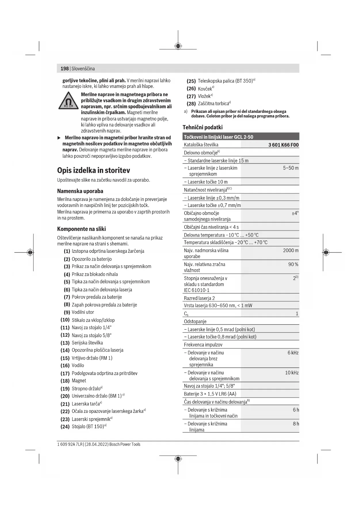 1 609 92A 7LR | (28.04.2022) Bosch Power ToolsSlovenščina | 199 Točkovni in linijski laser GCL 2-50 – Linijsko delovanje 16h – Točkovni način 22h Teža v skladu z EPTA- Procedure 01:2014 0,49kg Dimenzije (dolžinaךirina× višina) – Brez vrtljivega držala 112x55x106mm – Z vrtljivim držalom 132x81x163 mm Vrsta zaščite IP54 (zaščita pred prahom in škropljenjem vode) A) Delovno območje se lahko zaradi neugodnih pogojev v okolici (na primer zaradi neposrednega sončnega sevanja) zmanjša.