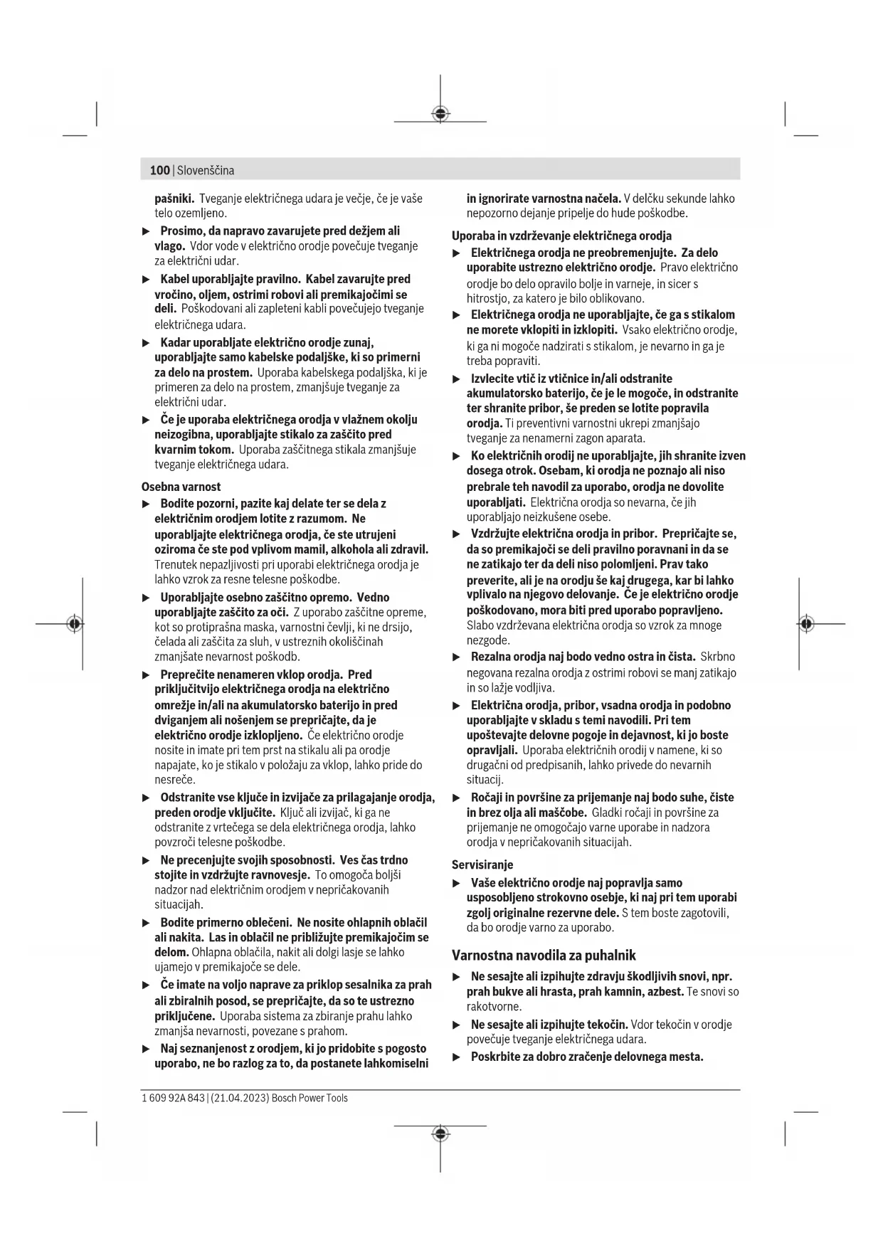 u Prosimo, da orodje zavarujete pred dežjem ali vlago. Vdor vode v električno orodje povečuje tveganje za električni udar. u Če je uporaba električnega orodja v vlažnem okolju neizogibna, uporabljajte stikalo za zaščito pred kvarnim tokom. Uporaba zaščitnega stikala zmanjšuje tveganje električnega udara. u Ne uporabljajte električnega orodja s poškodovanim kablom. Ne dotikajte se poškodovanega električnega kabla. Če se kabel poškoduje med delom, izvlecite omrežni vtič iz vtičnice. Poškodovani kabli povečujejo tveganje električnega udara. u Ne povozite kabla in ga ne stiskajte. Ne vlecite za kabel, če želite vtič izvleči iz vtičnice ali premakniti električno orodje. Poškodovani kabli povečujejo tveganje električnega udara. u Pred nastavljanjem orodja, zamenjavo delov pribora ali odlaganjem električnega orodja izvlecite vtič iz vtičnice. Ta previdnostni ukrep preprečuje nenameren zagon električnega orodja. Opis izdelka in storitev Preberite vsa varnostna opozorila in navodila. Neupoštevanje varnostnih opozoril in navodil lahko povzroči električni udar, požar in/ali hude poškodbe. Upoštevajte slike na začetku navodil za uporabo. Namenska uporaba Električno orodje je primerno za sesanje in izpihovanje snovi, ki niso zdravju škodljive. Električno orodje ni primerno za sesanje in izpihovanje vnetljivih materialov, kovinskih ostružkov in ostrih predmetov, kot so vijaki ali žeblji. Komponente na sliki Oštevilčenje komponent na sliki se nanaša na shemo električnega orodja na strani s shemami. (1) Ročaj (2) Stikalo za vklop/izklop (3) Tipka za zapah stikala za vklop/izklop (4) Nastavitveno kolesce za uravnavanje količine zraka (5) Izstopna odprtina za zrak (6) Pokrovi za oglene ščetke (7) Šoba (8) Vreča za prah (9) Vstopna odprtina za zrak (10) Oglene ščetke Tehnični podatki Puhalnik GBL 800 E Kataloška številka 3601J804.. Nazivna moč W 820 Prostornina zraka m³/min 4,5 Zračni tlak mbar 0–72 Teža po EPTA- Procedure01:2014 kg 1,8 Razred zaščite /II Navedbe veljajo za nazivne napetosti [U] 230V. Pri drugih napetostih in državno specifičnih izvedbah lahko te navedbe variirajo. Vrednosti se lahko razlikujejo glede na izdelek in so odvisne od pogojev uporabe in okoljskih pogojev. Več informacij je na voljo na spletni strani www.bosch-professional.com/wac. Podatki o hrupu/tresljajih Podatki o emisijah hrupa, pridobljeni v skladu s standardom EN62841‑1. A-vrednotena raven hrupa za električno orodje običajno znaša: raven zvočnega tlaka 89dB(A); raven zvočne moči 100dB(A). Negotovost K=3dB. Uporabljajte zaščito za sluh! Skupne vrednosti tresljajev a