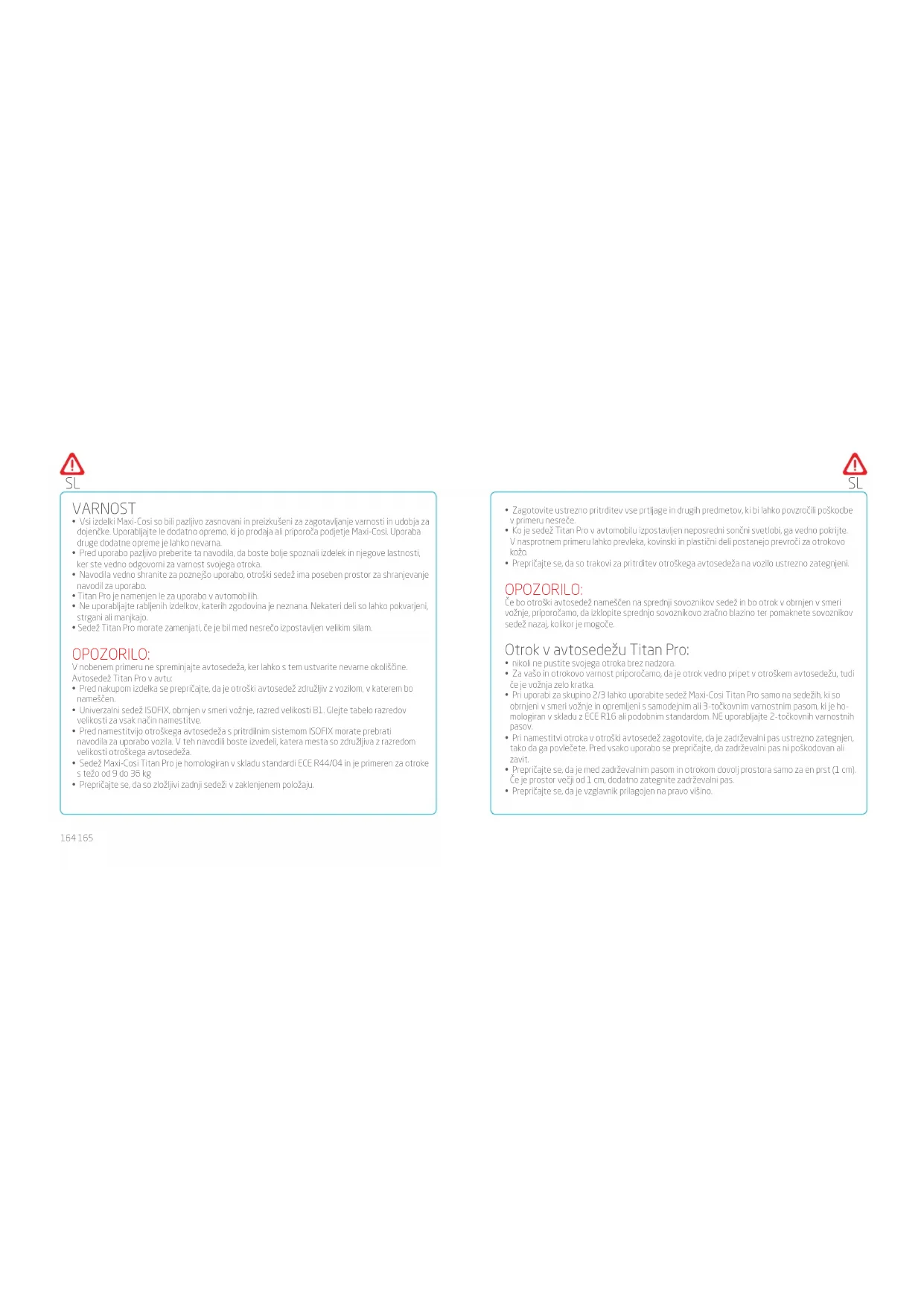 - Če obstaja kakršenkoli dvom o pravilni namestitvi ali uporabi sistema, uporabniku svetujemo, da se obrne na distributerja ali proizvajalca sistema za zadrževanje otrok.168 169 SLSL NEGA Otroški avtosedež naj bo vedno čist. Ne uporabljajte maziv ali grobih čistilnih sredstev. Vstavek za malčke: Vstavek v vašem otroškem sedežu Titan Pro spada med sestavne dele, ki zagotavljajo učinkovitost delovanja sistema za zadrževanje otrok s težo 9–15 kg, skupina 1. Lahko ga odstranite in za pranje odstranite njegovo prevleko, vendar ga obvezno namestite nazaj na njegovo mesto ter vedno uporabljate samo ta uradni vstavek Maxi-Cosi Titan Pro. Ta vstavek se lahko uporablja izključno s sedežem Titan Pro. Tkanina: