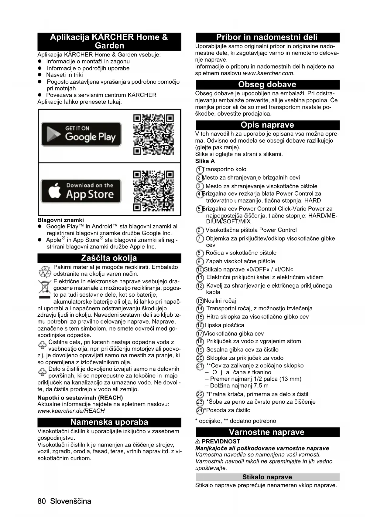 sta blagovni znamki ali regi- strirani blagovni znamki družbe Apple Inc. Zaščita okolja Pakirni material je mogoče reciklirati. Embalažo odstranite na okolju varen način. Električne in elektronske naprave vsebujejo dra- gocene materiale z možnostjo recikliranja, pogos- to pa tudi sestavne dele, kot so baterije, akumulatorske baterije ali olja, ki lahko pri napač- ni uporabi ali napačnem odstranjevanju škodujejo zdravju ljudi in okolju. Navedeni sestavni deli so kljub te- mu potrebni za pravilno delovanje naprave. Naprave, označene s tem simbolom, ne smete odvreči med go- spodinjske odpadke. Čistilna dela, pri katerih nastaja odpadna voda z vsebnostjo olja, npr. pri čiščenju motorjev ali podvo- zij, je dovoljeno opravljati samo na mestih za pranje, ki so opremljena z izločevalnikom olja. Delo s čistili je dovoljeno izvajati samo na delovnih površinah, ki so neprepustne za tekočine in imajo priključek na kanalizacijo za umazano vodo. Ne dovoli- te, da čistila prodrejo v vodo ali zemljo. Napotki o sestavinah (REACH) Aktualne informacije najdete na spletnem naslovu: www.kaercher.de/REACH Namenska uporaba Visokotlačni čistilnik uporabljajte izključno v zasebnem gospodinjstvu. Visokotlačni čistilnik je namenjen za čiščenje strojev, vozil, zgradb, orodja, fasad, teras, vrtnih naprav itd. z vi- sokotlačnim curkom. Pribor in nadomestni deli Uporabljajte samo originalni pribor in originalne nado- mestne dele, ki zagotavljajo varno in nemoteno delova- nje naprave. Informacije o priboru in nadomestnih delih najdete na spletnem naslovu www.kaercher.com. Obseg dobave Obseg dobave je upodobljen na embalaži. Pri odstra- njevanju embalaže preverite, ali je vsebina popolna. Če manjka pribor ali če so med transportom nastale po- škodbe, obvestite prodajalca. Opis naprave V teh navodilih za uporabo je opisana vsa možna opre- ma. Odvisno od modela se obsegi dobave razlikujejo (glejte pakiranje). Slike si oglejte na strani s slikami. Slika A 1 Transportno kolo 2 Mesto za shranjevanje brizgalnih cevi 3 Mesto za shranjevanje visokotlačne pištole 4 Brizgalna cev rezkarja blata Power Control za trdovratno umazanijo, tlačna stopnja: HARD 5 Brizgalna cev Power Control Click-Vario Power za najpogostejša čiščenja, tlačne stopnje: HARD/ME-