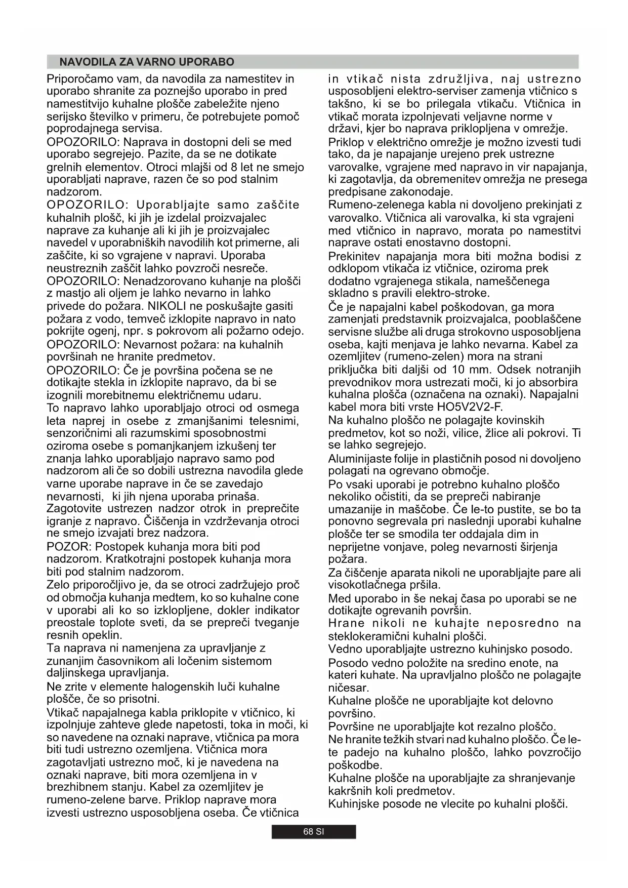 68 SI Priklop v električno omrežje je možno izvesti tudi tako, da je napajanje urejeno prek ustrezne varovalke, vgrajene med napravo in vir napajanja, ki zagotavlja, da obremenitev omrežja ne presega predpisane zakonodaje. Na kuhalno ploščo ne polagajte kovinskih predmetov, kot so noži, vilice, žlice ali pokrovi. Ti se lahko segrejejo. Če je napajalni kabel poškodovan, ga mora zamenjati predstavnik proizvajalca, pooblaščene servisne službe ali druga strokovno usposobljena oseba, kajti menjava je lahko nevarna. Kabel za ozemljitev (rumeno-zelen) mora na strani priključka biti daljši od 10 mm. Odsek notranjih prevodnikov mora ustrezati moči, ki jo absorbira kuhalna plošča (označena na oznaki). Napajalni kabel mora biti vrste HO5V2V2-F. Prekinitev napajanja mora biti možna bodisi z odklopom vtikača iz vtičnice, oziroma prek dodatno vgrajenega stikala, nameščenega skladno s pravili elektro-stroke. Med uporabo in še nekaj časa po uporabi se ne dotikajte ogrevanih površin. Hrane nikoli ne kuhajte neposredno na steklokeramični kuhalni plošči. Posodo vedno položite na sredino enote, na kateri kuhate. Na upravljalno ploščo ne polagajte ničesar. Kuhalne plošče ne uporabljajte kot delovno površino. in vtikač nista združljiva, naj ustrezno usposobljeni elektro-serviser zamenja vtičnico s takšno, ki se bo prilegala vtikaču. Vtičnica in vtikač morata izpolnjevati veljavne norme v državi, kjer bo naprava priklopljena v omrežje. Površine ne uporabljajte kot rezalno ploščo. Kuhalne plošče na uporabljajte za shranjevanje kakršnih koli predmetov. Kuhinjske posode ne vlecite po kuhalni plošči. Po vsaki uporabi je potrebno kuhalno ploščo nekoliko očistiti, da se prepreči nabiranje umazanije in maščobe. Če le-to pustite, se bo ta ponovno segrevala pri naslednji uporabi kuhalne plošče ter se smodila ter oddajala dim in neprijetne vonjave, poleg nevarnosti širjenja požara. Aluminijaste folije in plastičnih posod ni dovoljeno polagati na ogrevano območje. Rumeno-zelenega kabla ni dovoljeno prekinjati z varovalko. Vtičnica ali varovalka, ki sta vgrajeni med vtičnico in napravo, morata po namestitvi naprave ostati enostavno dostopni. Vedno uporabljajte ustrezno kuhinjsko posodo. Za čiščenje aparata nikoli ne uporabljajte pare ali visokotlačnega pršila. Ne hranite težkih stvari nad kuhalno ploščo. Če le- te padejo na kuhalno ploščo, lahko povzročijo poškodbe.Med kuhalno ploščo in zadnjo steno mora biti najmanj 55 mm in najmanj 150 mm med kuhalno ploščo in navpičnim pohištvom ali stenami na bočni strani. Če boste nad kuhalno ploščo vgradili pohištvo, mora najmanjša razdalja znašati 700 mm. Pri nameščanju nape nad kuhalno ploščo, si oglejte pogoje namestitve za napo, vendar pa v nobenem primeru ne sme biti razdalja med kuhalno ploščo in napo manjša od 700 mm.