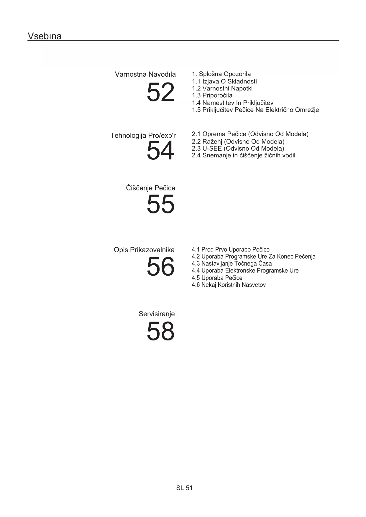 SL 51 Servisiranje 58• Med kuhanjem lahko vlaga kondenzira znotraj odprtine pečice ali na steklu vrat. To je normalno stanje. Za zmanjšanje tega učinka počakajte 10-15 minut po vklopu napajanja, preden hrano vstavite v pečico. V vsakem primeru kondenzacija izgine, ko pečica doseže temperaturo za kuhanje.