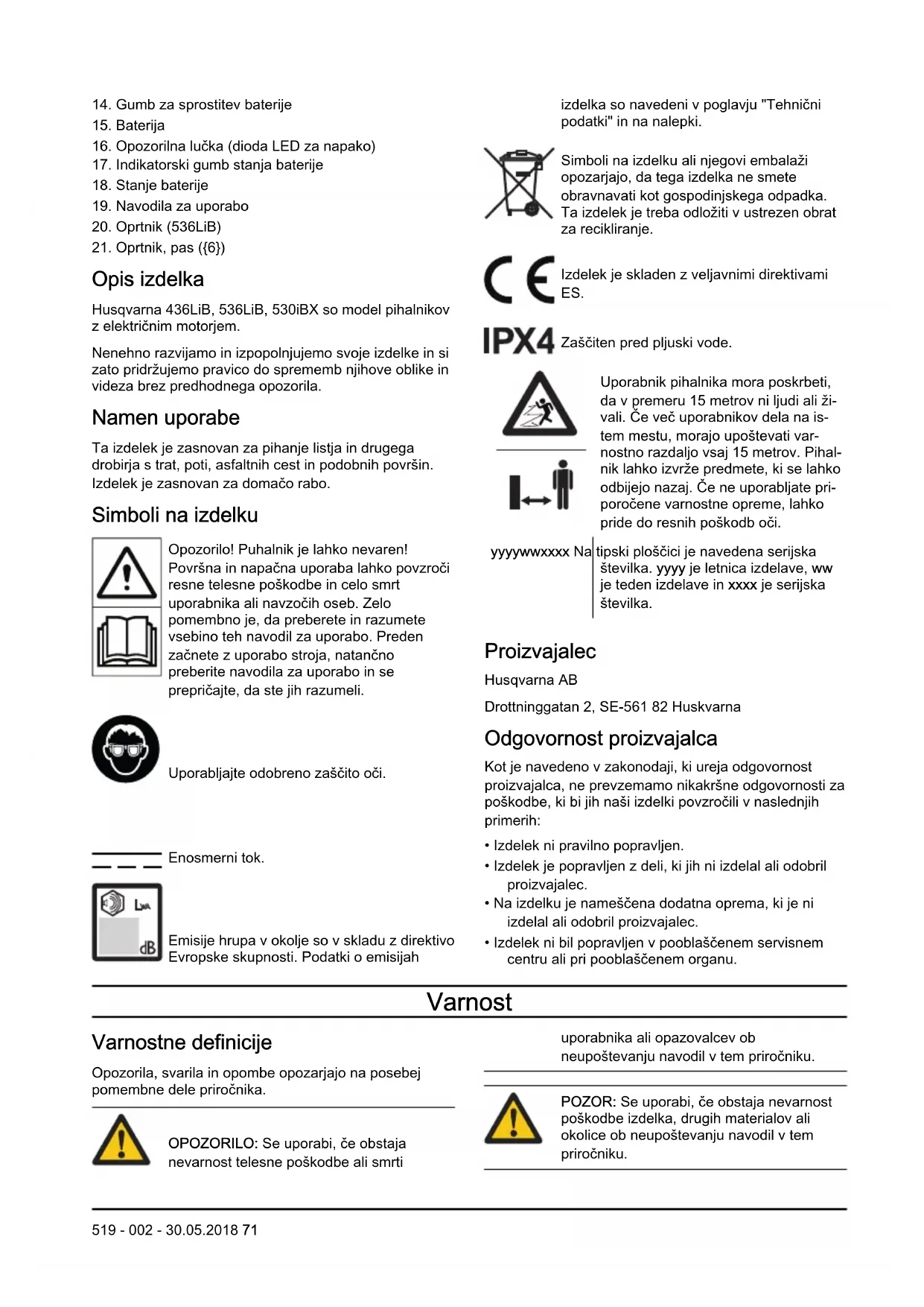 Opis izdelka Husqvarna 436LiB, 536LiB, 530iBX so model pihalnikov z električnim motorjem. Nenehno razvijamo in izpopolnjujemo svoje izdelke in si zato pridržujemo pravico do sprememb njihove oblike in videza brez predhodnega opozorila. Namen uporabe Ta izdelek je zasnovan za pihanje listja in drugega drobirja s trat, poti, asfaltnih cest in podobnih površin. Izdelek je zasnovan za domačo rabo. Simboli na izdelku Opozorilo! Puhalnik je lahko nevaren! Površna in napačna uporaba lahko povzroči resne telesne poškodbe in celo smrt uporabnika ali navzočih oseb. Zelo pomembno je, da preberete in razumete vsebino teh navodil za uporabo. Preden začnete z uporabo stroja, natančno preberite navodila za uporabo in se prepričajte, da ste jih razumeli. Uporabljajte odobreno zaščito oči. Enosmerni tok. Emisije hrupa v okolje so v skladu z direktivo Evropske skupnosti. Podatki o emisijah izdelka so navedeni v poglavju "Tehnični podatki" in na nalepki. Simboli na izdelku ali njegovi embalaži opozarjajo, da tega izdelka ne smete obravnavati kot gospodinjskega odpadka. Ta izdelek je treba odložiti v ustrezen obrat za recikliranje. Izdelek je skladen z veljavnimi direktivami ES. Zaščiten pred pljuski vode. Uporabnik pihalnika mora poskrbeti, da v premeru 15 metrov ni ljudi ali ži- vali. Če več uporabnikov dela na is- tem mestu, morajo upoštevati var- nostno razdaljo vsaj 15 metrov. Pihal- nik lahko izvrže predmete, ki se lahko odbijejo nazaj. Če ne uporabljate pri- poročene varnostne opreme, lahko pride do resnih poškodb oči. yyyywwxxxx Na tipski ploščici je navedena serijska številka. yyyy je letnica izdelave, ww je teden izdelave in xxxx je serijska številka. Proizvajalec Husqvarna AB Drottninggatan 2, SE-561 82 Huskvarna Odgovornost proizvajalca Kot je navedeno v zakonodaji, ki ureja odgovornost proizvajalca, ne prevzemamo nikakršne odgovornosti za poškodbe, ki bi jih naši izdelki povzročili v naslednjih primerih: