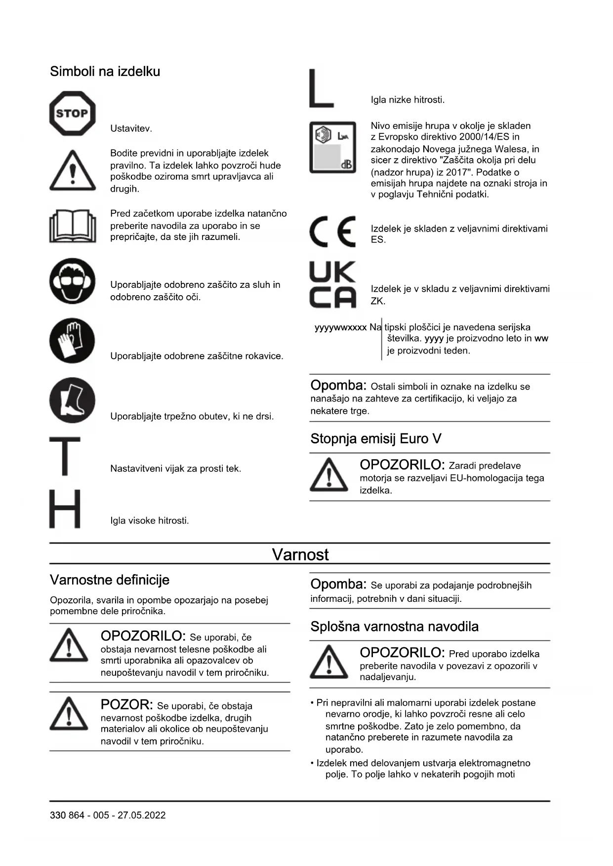 Ustavitev. Bodite previdni in uporabljajte izdelek pravilno. Ta izdelek lahko povzroči hude poškodbe oziroma smrt upravljavca ali drugih. Pred začetkom uporabe izdelka natančno preberite navodila za uporabo in se prepričajte, da ste jih razumeli. Uporabljajte odobreno zaščito za sluh in odobreno zaščito oči. Uporabljajte odobrene zaščitne rokavice. Uporabljajte trpežno obutev, ki ne drsi. Nastavitveni vijak za prosti tek. Igla visoke hitrosti. Igla nizke hitrosti. Nivo emisije hrupa v okolje je skladen z Evropsko direktivo 2000/14/ES in zakonodajo Novega južnega Walesa, in sicer z direktivo "Zaščita okolja pri delu (nadzor hrupa) iz 2017". Podatke o emisijah hrupa najdete na oznaki stroja in v poglavju Tehnični podatki. Izdelek je skladen z veljavnimi direktivami ES. Izdelek je v skladu z veljavnimi direktivami ZK. yyyywwxxxx Na tipski ploščici je navedena serijska številka. yyyy je proizvodno leto in ww je proizvodni teden. Opomba: Ostali simboli in oznake na izdelku se nanašajo na zahteve za certifikacijo, ki veljajo za nekatere trge. Stopnja emisij Euro V OPOZORILO: Zaradi predelave motorja se razveljavi EU-homologacija tega izdelka. Varnost Varnostne definicije Opozorila, svarila in opombe opozarjajo na posebej pomembne dele priročnika. OPOZORILO: Se uporabi, če obstaja nevarnost telesne poškodbe ali smrti uporabnika ali opazovalcev ob neupoštevanju navodil v tem priročniku. POZOR: Se uporabi, če obstaja nevarnost poškodbe izdelka, drugih materialov ali okolice ob neupoštevanju navodil v tem priročniku. Opomba: Se uporabi za podajanje podrobnejših informacij, potrebnih v dani situaciji. Splošna varnostna navodila OPOZORILO: Pred uporabo izdelka preberite navodila v povezavi z opozorili v nadaljevanju.