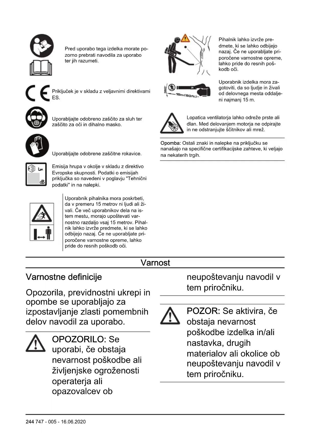 zorno prebrati navodila za uporabo ter jih razumeti. Priključek je v skladu z veljavnimi direktivami ES. Uporabljajte odobreno zaščito za sluh ter zaščito za oči in dihalno masko. Uporabljajte odobrene zaščitne rokavice. Emisija hrupa v okolje v skladu z direktivo Evropske skupnosti. Podatki o emisijah priključka so navedeni v poglavju "Tehnični podatki" in na nalepki. Uporabnik pihalnika mora poskrbeti, da v premeru 15 metrov ni ljudi ali ži- vali. Če več uporabnikov dela na is- tem mestu, morajo upoštevati var- nostno razdaljo vsaj 15 metrov. Pihal- nik lahko izvrže predmete, ki se lahko odbijejo nazaj. Če ne uporabljate pri- poročene varnostne opreme, lahko pride do resnih poškodb oči. Pihalnik lahko izvrže pre- dmete, ki se lahko odbijejo nazaj. Če ne uporabljate pri- poročene varnostne opreme, lahko pride do resnih poš- kodb oči. Uporabnik izdelka mora za- gotoviti, da so ljudje in živali od delovnega mesta oddalje- ni najmanj 15 m. Lopatica ventilatorja lahko odreže prste ali dlan. Med delovanjem motorja ne odpirajte in ne odstranjujte ščitnikov ali mrež. Opomba: Ostali znaki in nalepke na priključku se nanašajo na specifične certifikacijske zahteve, ki veljajo na nekaterih trgih. Varnost Varnostne definicije Opozorila, previdnostni ukrepi in opombe se uporabljajo za izpostavljanje zlasti pomembnih delov navodil za uporabo. OPOZORILO: Se uporabi, če obstaja nevarnost poškodbe ali življenjske ogroženosti operaterja ali opazovalcev ob neupoštevanju navodil v tem priročniku. POZOR: Se aktivira, če obstaja nevarnost poškodbe izdelka in/ali nastavka, drugih materialov ali okolice ob neupoštevanju navodil v tem priročniku. 244 747 - 005 - 16.06.2020Opomba: Se uporabi za podajanje podrobnejših informacij, potrebnih v dani situaciji. Splošna varnostna navodila OPOZORILO: Preden začnete uporabljati pripomoček, preberite naslednja varnostna navodila.