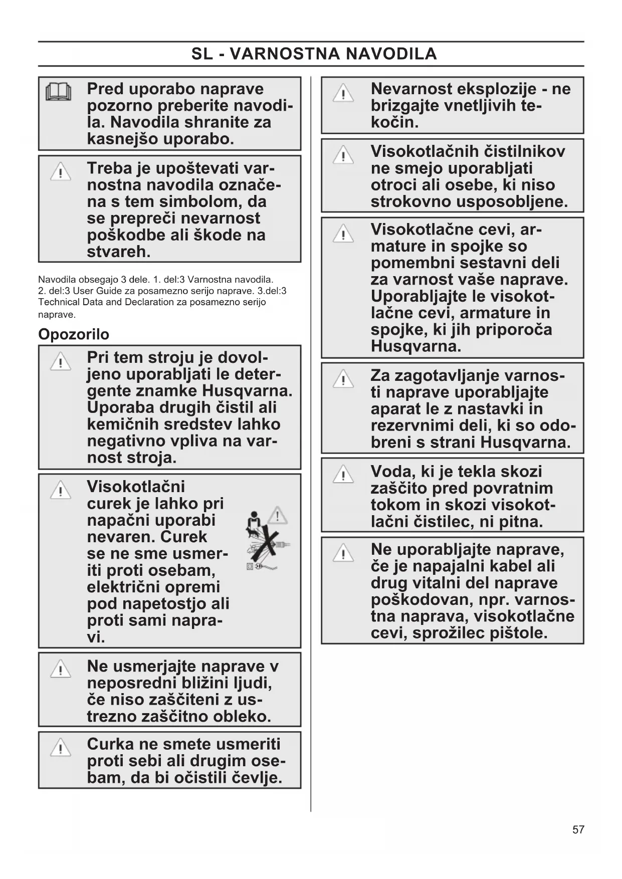 Technical Data and Declaration za posamezno serijo naprave. Opozorilo Pri tem stroju je dovol- jeno uporabljati le deter- gente znamke Husqvarna. Uporaba drugih čistil ali kemičnih sredstev lahko negativno vpliva na var- nost stroja. Visokotlačni curek je lahko pri napačni uporabi nevaren. Curek se ne sme usmer- iti proti osebam, električni opremi pod napetostjo ali proti sami napra- vi. Ne usmerjajte naprave v neposredni bližini ljudi, če niso zaščiteni z us- trezno zaščitno obleko. Curka ne smete usmeriti proti sebi ali drugim ose- bam, da bi očistili čevlje. Nevarnost eksplozije - ne brizgajte vnetljivih te- kočin. Visokotlačnih čistilnikov ne smejo uporabljati otroci ali osebe, ki niso strokovno usposobljene. Visokotlačne cevi, ar- mature in spojke so pomembni sestavni deli za varnost vaše naprave. Uporabljajte le visokot- lačne cevi, armature in spojke, ki jih priporoča Husqvarna. Za zagotavljanje varnos- ti naprave uporabljajte aparat le z nastavki in rezervnimi deli, ki so odo- breni s strani Husqvarna. Voda, ki je tekla skozi zaščito pred povratnim tokom in skozi visokot- lačni čistilec, ni pitna. Ne uporabljajte naprave, če je napajalni kabel ali drug vitalni del naprave poškodovan, npr. varnos- tna naprava, visokotlačne cevi, sprožilec pištole.58