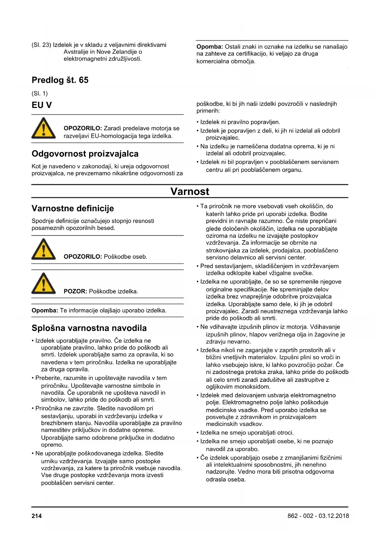 Avstralije in Nove Zelandije o elektromagnetni združljivosti. Opomba: Ostali znaki in oznake na izdelku se nanašajo na zahteve za certifikacijo, ki veljajo za druga komercialna območja. Predlog št. 65 (Sl. 1) EU V OPOZORILO: Zaradi predelave motorja se razveljavi EU-homologacija tega izdelka. Odgovornost proizvajalca Kot je navedeno v zakonodaji, ki ureja odgovornost proizvajalca, ne prevzemamo nikakršne odgovornosti za poškodbe, ki bi jih naši izdelki povzročili v naslednjih primerih: