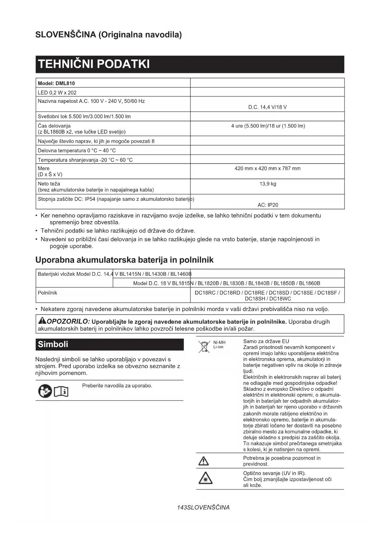 - Nekatere zgoraj navedene akumulatorske baterije in polnilniki morda v vaši državi prebivališča niso na voljo. OPOZORILO: Uporabljajte le zgoraj navedene akumulatorske baterije in polnilnike. Uporaba drugih akumulatorskih baterij in polnilnikov lahko povzroči telesne poškodbe in/ali požar. Simboli Naslednji simboli se lahko uporabljajo v povezavi s strojem. Pred uporabo izdelka se obvezno seznanite z njihovim pomenom. Preberite navodila za uporabo. Ni-MH Li-ion Samo za države EU Zaradi prisotnosti nevarnih komponent v opremi imajo lahko uporabljena električna in elektronska oprema, akumulatorji in baterije negativen vpliv na okolje in zdravje ljudi. Električnih in elektronskih naprav ali baterij ne odlagajte med gospodinjske odpadke! Skladno z evropsko Direktivo o odpadni električni in elektronski opremi, o akumula- torjih in baterijah ter odpadnih akumulator- jih in baterijah ter njeno uporabo v državnih zakonih morate rabljeno električno in elektronsko opremo, baterije in akumula- torje zbirati ločeno ter dostaviti na posebno zbiralno mesto za komunalne odpadke, ki deluje skladno s predpisi za zaščito okolja. To nakazuje simbol prečrtanega smetnjaka s kolesi, ki je natisnjen na opremi. Potrebna je posebna pozornost in previdnost. Optično sevanje (UV in IR). Čim bolj zmanjšajte izpostavljenost oči ali kože.144 SLOVENŠČINA Ne glejte v luč, ki sveti. Uporabite ustrezno zaščito ali očala za oči. Naprave ne uporabljajte v dežju ali snegu, če je priključena na izmenični tok. Gumb za ponovni zagon odklopnika. Opomba Ta izdelek vsebuje vire svetlobe razredov energijske učinkovitosti <C> in <D>. Priključitev na električno omrežje Napetost električnega omrežja se mora ujemati s podatki na tipski ploščici. Stroj deluje samo z enofazno izmenično napetostjo. To orodje je treba med uporabo ozemljiti, da se zaščiti upravljavca pred električnim udarom. Uporabljajte samo kabelske podaljške s tremi žicami, ki imajo ozemljitvene vtiče s tremi roglji in tri- polne vtičnice, v katere lahko priključite vtič orodja. VARNOSTNA OPOZORILA POMEMBNA VARNOSTNA NAVODILA OPOZORILO: Preberite vsa varnostna opo- zorila in navodila. Neupoštevanje opozoril in navodil lahko privede do električnega udara, požara in/ali resnih telesnih poškodb.