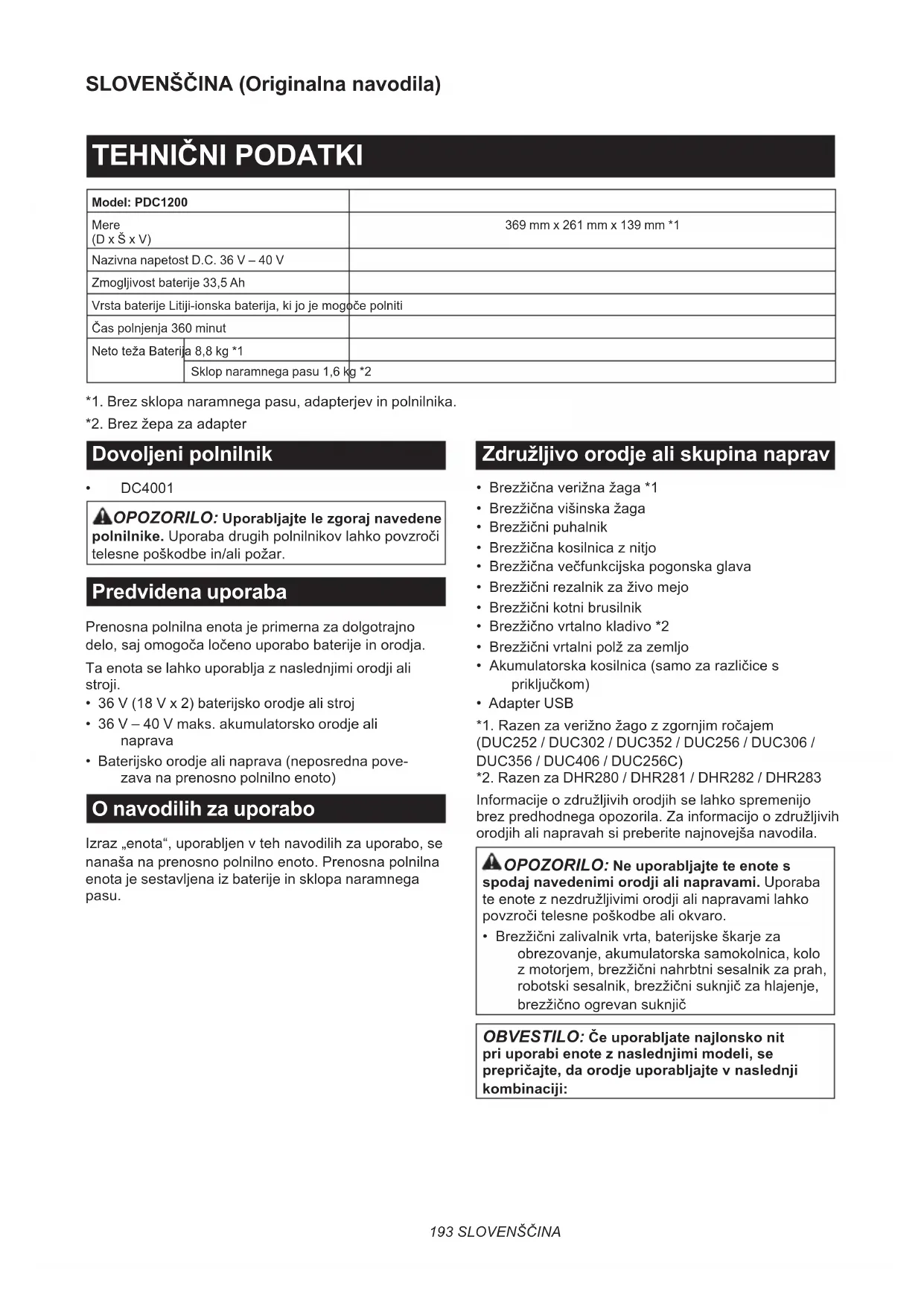 - DC4001 OPOZORILO: Uporabljajte le zgoraj navedene polnilnike. Uporaba drugih polnilnikov lahko povzroči telesne poškodbe in/ali požar. Predvidena uporaba Prenosna polnilna enota je primerna za dolgotrajno delo, saj omogoča ločeno uporabo baterije in orodja. Ta enota se lahko uporablja z naslednjimi orodji ali stroji.