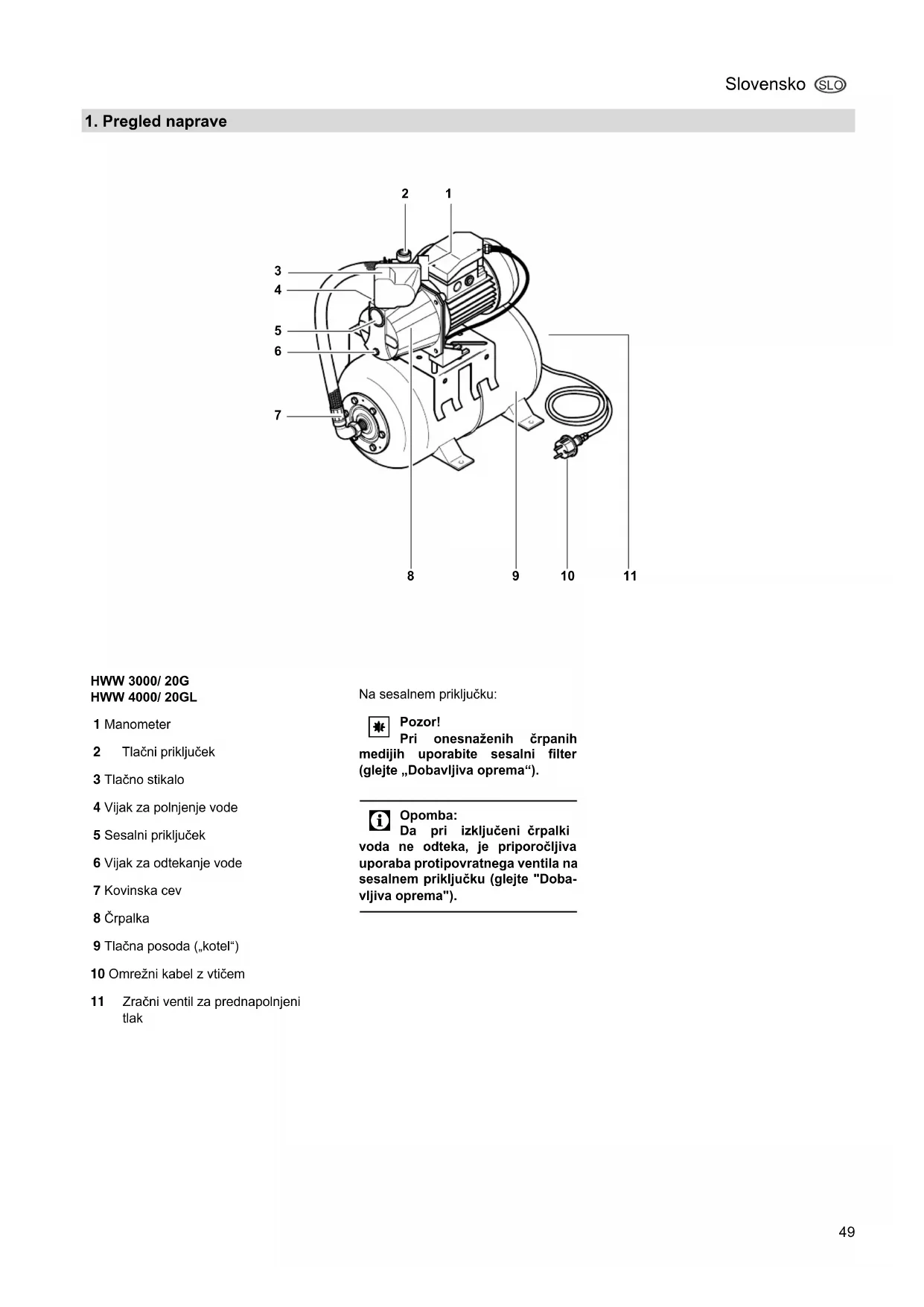 HWW 3000/ 20G HWW 4000/ 20GL 1 Manometer 2 Tlačni priključek 3 Tlačno stikalo 4 Vijak za polnjenje vode 5 Sesalni priključek 6 Vijak za odtekanje vode 7 Kovinska cev 8 Črpalka 9 Tlačna posoda („kotel“) 10 Omrežni kabel z vtičem 11 Zračni ventil za prednapolnjeni tlak Na sesalnem priključku: