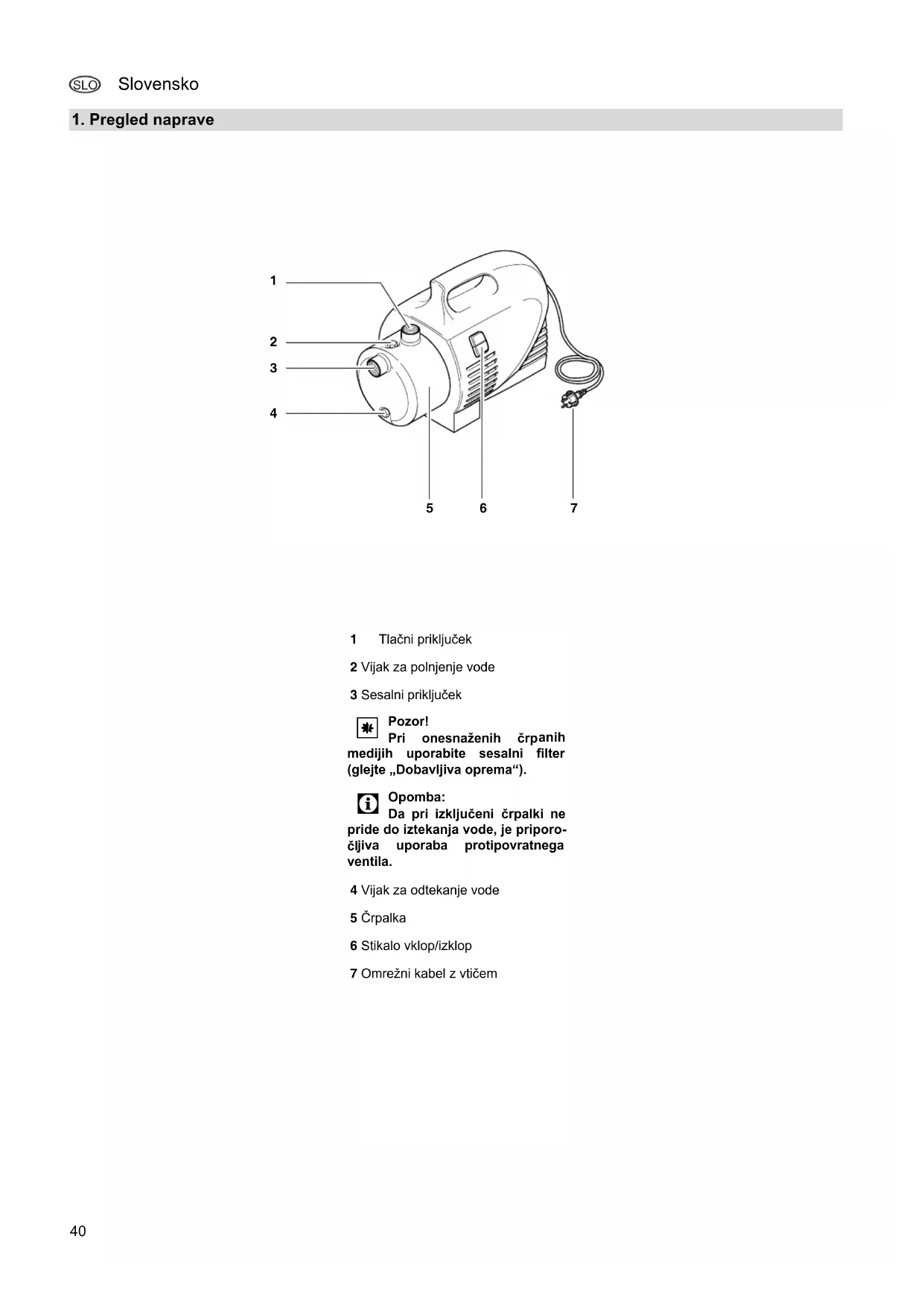 jiva uporaba protipovratnega ventila. 4 Vijak za odtekanje vode 5 Črpalka 6 Stikalo vklop/izklop 7 Omrežni kabel z vtičem Izvirna navodila za uporabo Izvirna navodila za uporabo Slovensko41 SLO Slovensko