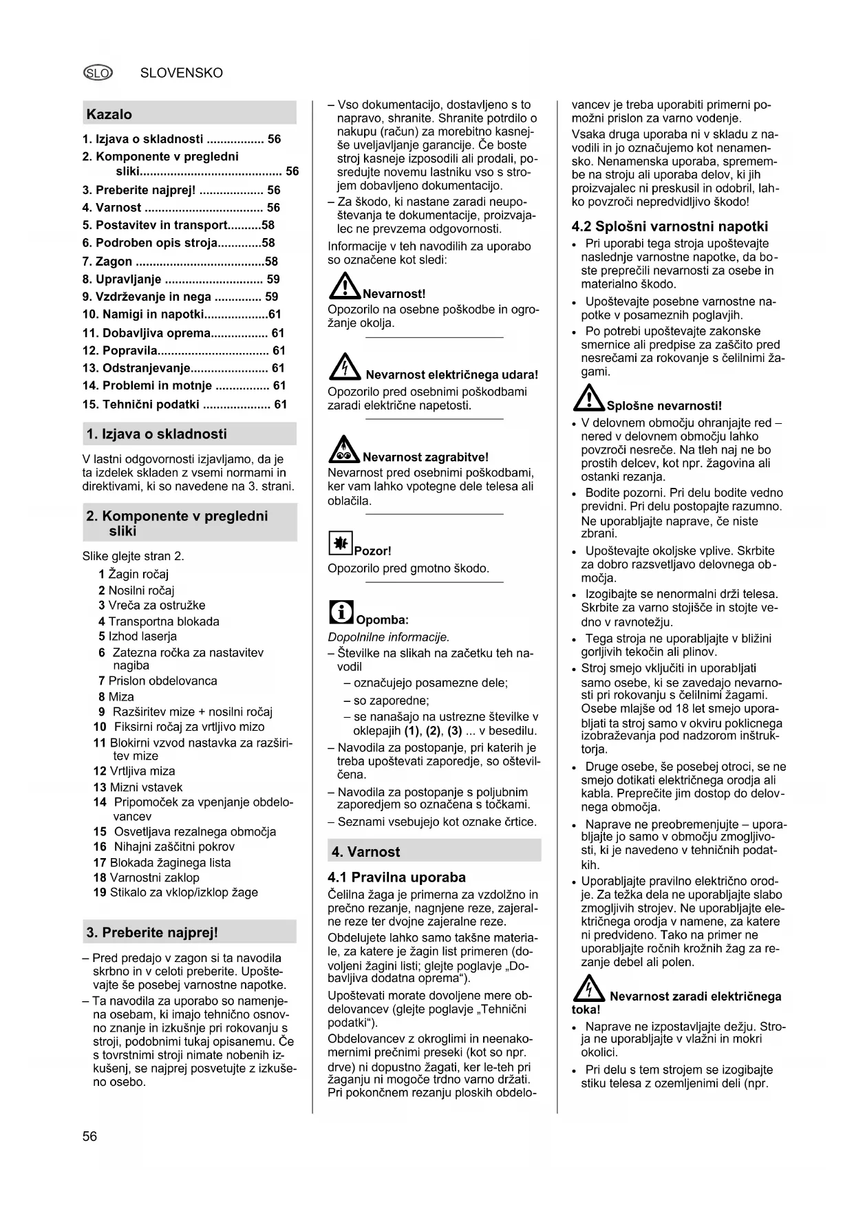 lov; v nasprotnem primeru se lahko pojavijo nesreče uporabnika. Stroja ne uporabljajte, če stikala ni mogoče vklopiti ali izklopiti. Ročaji morajo biti suhi in brez sledi olja in masti. Kabla ne uporabljajte za vlečenje vti- ča iz vtičnice. Kabel zaščitite pred vročino, oljem in ostrimi robovi. fNevarnost zaradi hrupa! Nosite glušnike. Zaradi zaščite pred hrupom pazite, da žagin list ni izkrivljen. Izkrivljen žagin list povzroča zelo močna nihanja. To se odraža v povišanem hrupu. DNevarnost zaradi laserskega sevanja! Laserski žarki lahko povzročijo težje poškodbe na očeh. Nikoli ne glejte v iz