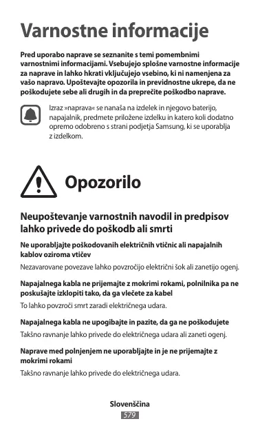 Varnostne informacije Pred uporabo naprave se seznanite s temi pomembnimi varnostnimi informacijami. Vsebujejo splošne varnostne informacije za naprave in lahko hkrati vključujejo vsebino, ki ni namenjena za vašo napravo. Upoštevajte opozorila in previdnostne ukrepe, da ne poškodujete sebe ali drugih in da preprečite poškodbo naprave. Izraz »naprava« se nanaša na izdelek in njegovo baterijo, napajalnik, predmete priložene izdelku in katero koli dodatno opremo odobreno s strani podjetja Samsung, ki se uporablja z izdelkom. Opozorilo Neupoštevanje varnostnih navodil in predpisov lahko privede do poškodb ali smrti Ne uporabljajte poškodovanih električnih vtičnic ali napajalnih kablov oziroma vtičev Nezavarovane povezave lahko povzročijo električni šok ali zanetijo ogenj. Napajalnega kabla ne prijemajte z mokrimi rokami, polnilnika pa ne poskušajte izklopiti tako, da ga vlečete za kabel To lahko povzroči smrt zaradi električnega udara. Napajalnega kabla ne upogibajte in pazite, da ga ne poškodujete Takšno ravnanje lahko privede do električnega udara ali zaneti ogenj. Naprave med polnjenjem ne uporabljajte in je ne prijemajte z mokrimi rokami Takšno ravnanje lahko privede do električnega udara. Slovenščina