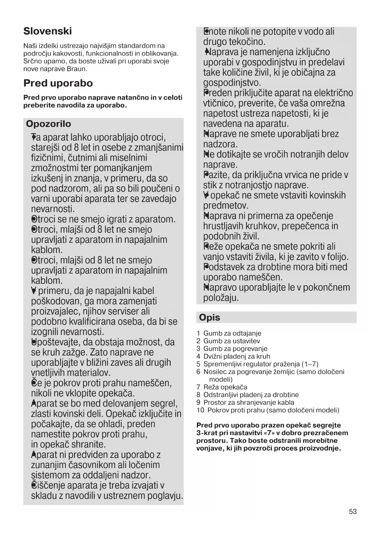 Napravo uporabljajte le v pokončnem položaju. Opis 1 Gumb za odtajanje 2 Gumb za ustavitev 3 Gumb za pogrevanje 4 Dvižni pladenj za kruh 5 Spremenljivi regulator praženja (1–7) 6 Nosilec za pogrevanje žemljic (samo določeni modeli) 7 Reža opekača 8 Odstranljivi pladenj za drobtine 9 Prostor za shranjevanje kabla 10 Pokrov proti prahu (samo določeni modeli) Pred prvo uporabo prazen opekač segrejte 3-krat pri nastavitvi «7» v dobro prezračenem prostoru. Tako boste odstranili morebitne vonjave, ki jih povzroči proces proizvodnje. 53Delovanje Pečete lahko kruh vseh velikosti, ki se prilega reži opekača.