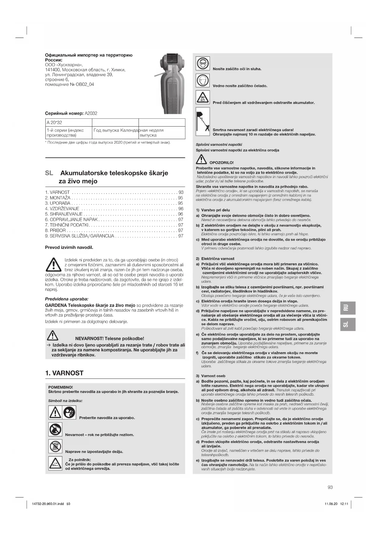 na suhem, zaprtem mestu, zavarovanem pred zmrzaljo. Odstranitev: (v skladu z Dir. 2012/19/EU) Izdelka ne smete odstraniti v običajne gospodinjske odpadke. Odstraniti ga je treba v skladu z veljavnimi lokalnimi predpisi o varstvu okolja. POMEMBNO! v Izdelek odstranite pri svojem krajevnem zbirališču odpadkov za recikliranje. Odstranitev akumulatorja: Li-ion GARDENA akumulator vsebuje litij-ionske celice, ki jih je treba ob koncu njihove življenjske dobe oddati ločeno od običajnih gospodinjskih odpadkov. 14732-20.960.01.indd 96 11.09.20 12:11SL