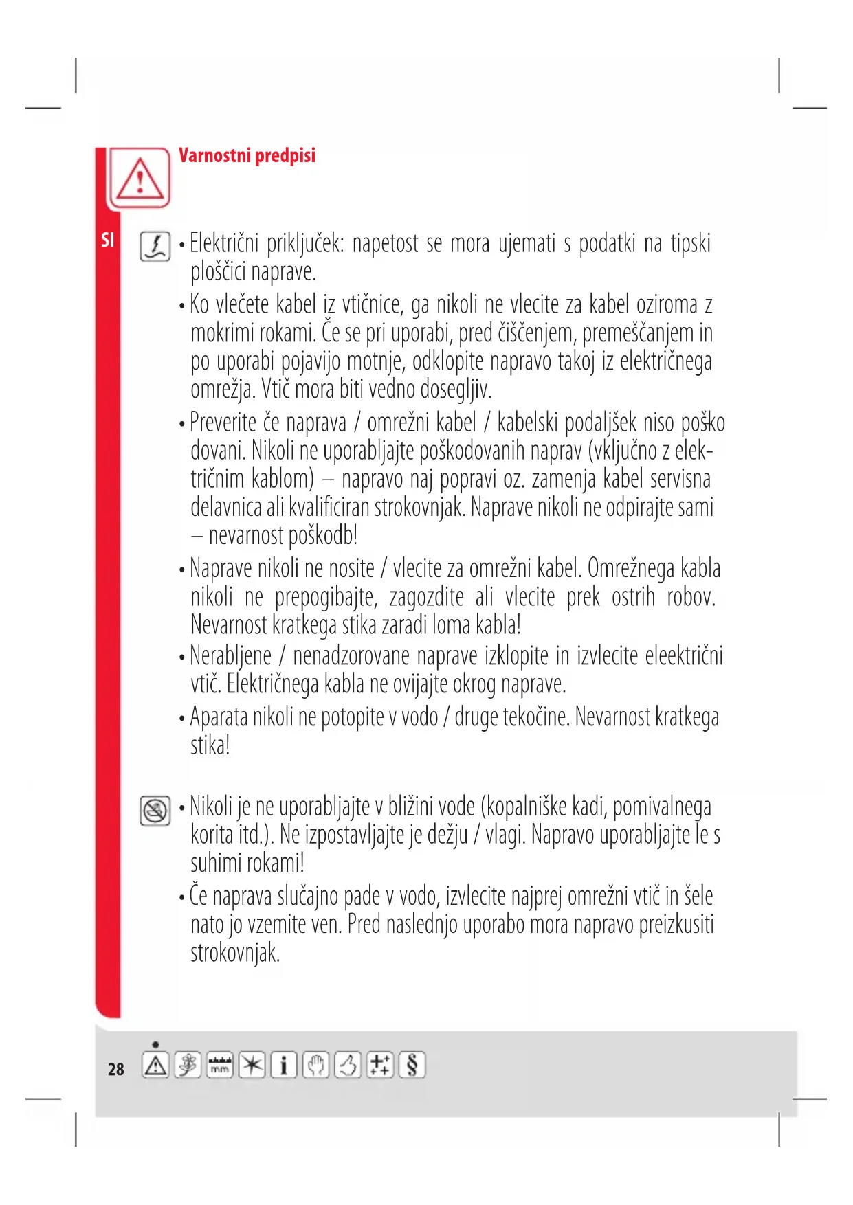 - Nikoli je ne uporabljajte v bližini vode (kopalniške kadi, pomivalnega korita itd.). Ne izpostavljajte je dežju / vlagi. Napravo uporabljajte le s suhimi rokami!29 Varnostni predpisi