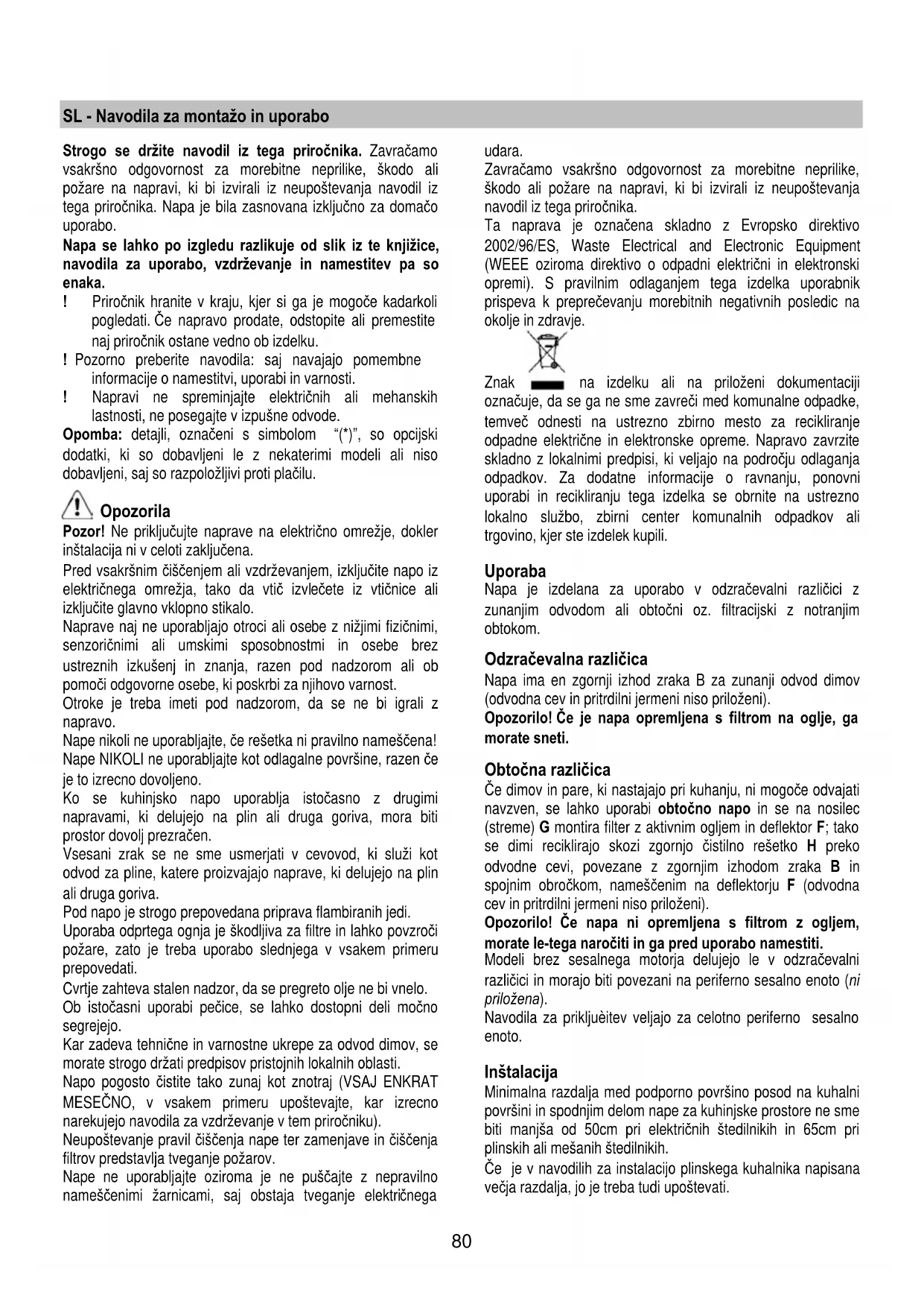 Ukoliko rasveta ne funkcioniše, kontrolišite da li ste pravilno postavili lampe na njihovo mesto pre nego što pozovete servisnu službu radi asistencije.80 SL - Navodila za montažo in uporabo Strogo se držite navodil iz tega priročnika. Zavračamo vsakršno odgovornost za morebitne neprilike, škodo ali požare na napravi, ki bi izvirali iz neupoštevanja navodil iz tega priročnika. Napa je bila zasnovana izključno za domačo uporabo. Napa se lahko po izgledu razlikuje od slik iz te knjižice, navodila za uporabo, vzdrževanje in namestitev pa so enaka. ! Priročnik hranite v kraju, kjer si ga je mogoče kadarkoli pogledati. Če napravo prodate, odstopite ali premestite naj priročnik ostane vedno ob izdelku. ! Pozorno preberite navodila: saj navajajo pomembne informacije o namestitvi, uporabi in varnosti. ! Napravi ne spreminjajte električnih ali mehanskih lastnosti, ne posegajte v izpušne odvode. Opomba: detajli, označeni s simbolom “(*)”, so opcijski dodatki, ki so dobavljeni le z nekaterimi modeli ali niso dobavljeni, saj so razpoložljivi proti plačilu. Opozorila Pozor! Ne priključujte naprave na električno omrežje, dokler inštalacija ni v celoti zaključena. Pred vsakršnim čiščenjem ali vzdrževanjem, izključite napo iz električnega omrežja, tako da vtič izvlečete iz vtičnice ali izključite glavno vklopno stikalo. Naprave naj ne uporabljajo otroci ali osebe z nižjimi fizičnimi, senzoričnimi ali umskimi sposobnostmi in osebe brez ustreznih izkušenj in znanja, razen pod nadzorom ali ob pomoči odgovorne osebe, ki poskrbi za njihovo varnost. Otroke je treba imeti pod nadzorom, da se ne bi igrali z napravo. Nape nikoli ne uporabljajte, če rešetka ni pravilno nameščena! Nape NIKOLI ne uporabljajte kot odlagalne površine, razen če je to izrecno dovoljeno. Ko se kuhinjsko napo uporablja istočasno z drugimi napravami, ki delujejo na plin ali druga goriva, mora biti prostor dovolj prezračen. Vsesani zrak se ne sme usmerjati v cevovod, ki služi kot odvod za pline, katere proizvajajo naprave, ki delujejo na plin ali druga goriva. Pod napo je strogo prepovedana priprava flambiranih jedi. Uporaba odprtega ognja je škodljiva za filtre in lahko povzroči požare, zato je treba uporabo slednjega v vsakem primeru prepovedati. Cvrtje zahteva stalen nadzor, da se pregreto olje ne bi vnelo. Ob istočasni uporabi pečice, se lahko dostopni deli močno segrejejo. Kar zadeva tehnične in varnostne ukrepe za odvod dimov, se morate strogo držati predpisov pristojnih lokalnih oblasti. Napo pogosto čistite tako zunaj kot znotraj (VSAJ ENKRAT MESEČNO, v vsakem primeru upoštevajte, kar izrecno narekujejo navodila za vzdrževanje v tem priročniku). Neupoštevanje pravil čiščenja nape ter zamenjave in čiščenja filtrov predstavlja tveganje požarov. Nape ne uporabljajte oziroma je ne puščajte z nepravilno nameščenimi žarnicami, saj obstaja tveganje elektri čnega udara. Zavračamo vsakršno odgovornost za morebitne neprilike, škodo ali požare na napravi, ki bi izvirali iz neupoštevanja navodil iz tega priročnika. Ta naprava je označena skladno z Evropsko direktivo 2002/96/ES, Waste Electrical and Electronic Equipment (WEEE oziroma direktivo o odpadni električni in elektronski opremi). S pravilnim odlaganjem tega izdelka uporabnik prispeva k preprečevanju morebitnih negativnih posledic na okolje in zdravje. Znak na izdelku ali na priloženi dokumentaciji označuje, da se ga ne sme zavreči med komunalne odpadke, temveč odnesti na ustrezno zbirno mesto za recikliranje odpadne električne in elektronske opreme. Napravo zavrzite skladno z lokalnimi predpisi, ki veljajo na področju odlaganja odpadkov. Za dodatne informacije o ravnanju, ponovni uporabi in recikliranju tega izdelka se obrnite na ustrezno lokalno službo, zbirni center komunalnih odpadkov ali trgovino, kjer ste izdelek kupili. Uporaba Napa je izdelana za uporabo v odzračevalni različici z zunanjim odvodom ali obtočni oz. filtracijski z notranjim obtokom. Odzračevalna različica Napa ima en zgornji izhod zraka B za zunanji odvod dimov (odvodna cev in pritrdilni jermeni niso priloženi). Opozorilo! Če je napa opremljena s filtrom na oglje, ga morate sneti. Obtočna različica Če dimov in pare, ki nastajajo pri kuhanju, ni mogoče odvajati navzven, se lahko uporabi obtočno napo in se na nosilec (streme) G montira filter z aktivnim ogljem in deflektor F; tako se dimi reciklirajo skozi zgornjo čistilno rešetko H preko odvodne cevi, povezane z zgornjim izhodom zraka B in spojnim obročkom, nameščenim na deflektorju F (odvodna cev in pritrdilni jermeni niso priloženi). Opozorilo! Če napa ni opremljena s filtrom z ogljem, morate le-tega naročiti in ga pred uporabo namestiti. Modeli brez sesalnega motorja delujejo le v odzračevalni različici in morajo biti povezani na periferno sesalno enoto (ni priložena). Navodila za prikljuèitev veljajo za celotno periferno sesalno enoto. Inštalacija Minimalna razdalja med podporno površino posod na kuhalni površini in spodnjim delom nape za kuhinjske prostore ne sme biti manjša od 50cm pri električnih štedilnikih in 65cm pri plinskih ali mešanih štedilnikih. Če je v navodilih za instalacijo plinskega kuhalnika napisana večja razdalja, jo je treba tudi upoštevati.81