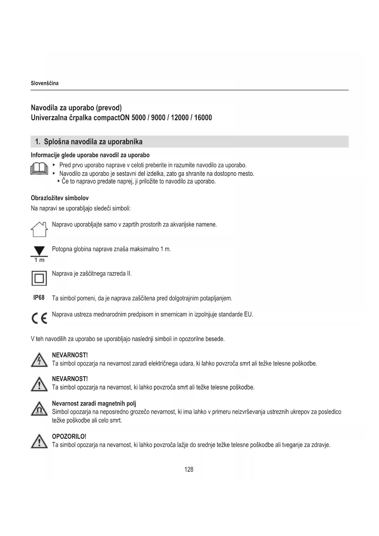 Informacije glede uporabe navodil za uporabo ▶ Pred prvo uporabo naprave v celoti preberite in razumite navodilo za uporabo. ▶ Navodilo za uporabo je sestavni del izdelka, zato ga shranite na dostopno mesto. ▶ Če to napravo predate naprej, ji priložite to navodilo za uporabo. Obrazložitev simbolov Na napravi se uporabljajo sledeči simboli: Napravo uporabljajte samo v zaprtih prostorih za akvarijske namene. Potopna globina naprave znaša maksimalno 1 m. Naprava je zaščitnega razreda II. Ta simbol pomeni, da je naprava zaščitena pred dolgotrajnim potapljanjem. Naprava ustreza mednarodnim predpisom in smernicam in izpolnjuje standarde EU. V teh navodilih za uporabo se uporabljajo naslednji simboli in opozorilne besede. NEVARNOST! Ta simbol opozarja na nevarnost zaradi električnega udara, ki lahko povzroča smrt ali težke telesne poškodbe. NEVARNOST! Ta simbol opozarja na nevarnost, ki lahko povzroča smrt ali težke telesne poškodbe. Nevarnost zaradi magnetnih polj Simbol opozarja na neposredno grozečo nevarnost, ki ima lahko v primeru neizvrševanja ustreznih ukrepov za posledico težke poškodbe ali celo smrt. OPOZORILO! Ta simbol opozarja na nevarnost, ki lahko povzroča lažje do srednje težke telesne poškodbe ali tveganje za zdravje. IP68129 Slovenščina POZOR! Ta simbol pomeni, da lahko pride do materialne škode. Nasvet s koristnimi informacijami in namigi.