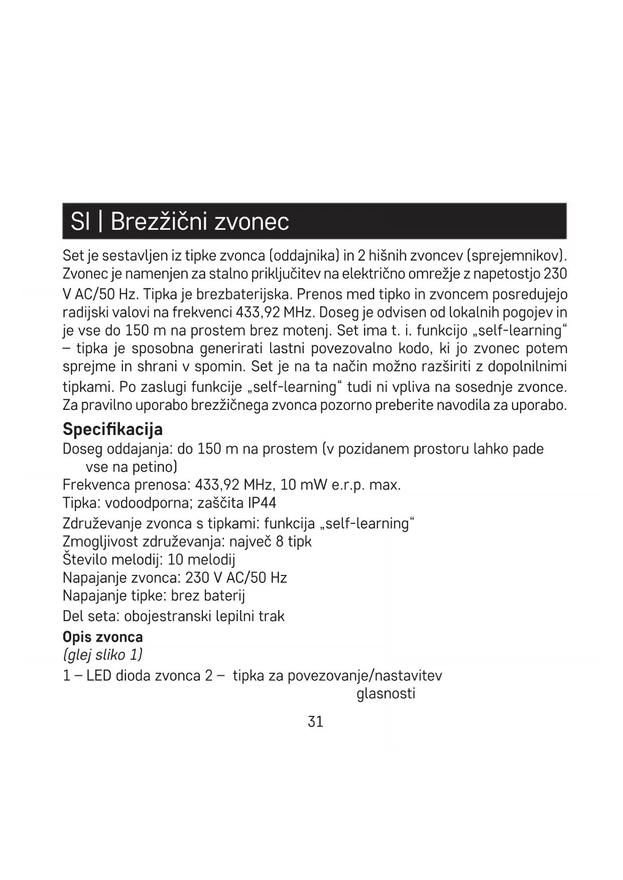 - Zvonec (sprejemnik) je namenjen le za notranjo uporabo v suhih prostorih.