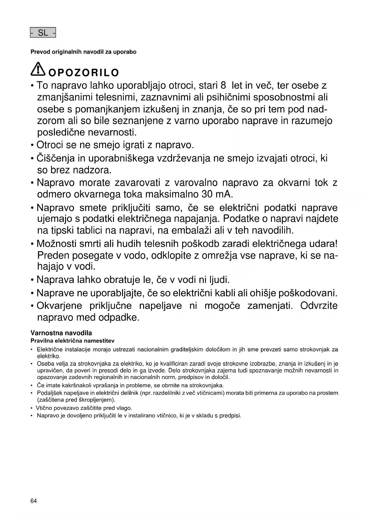- Preden sežete v vodo, odklopite iz omrežne napetosti vse v vodi nahajajoče se naprave.