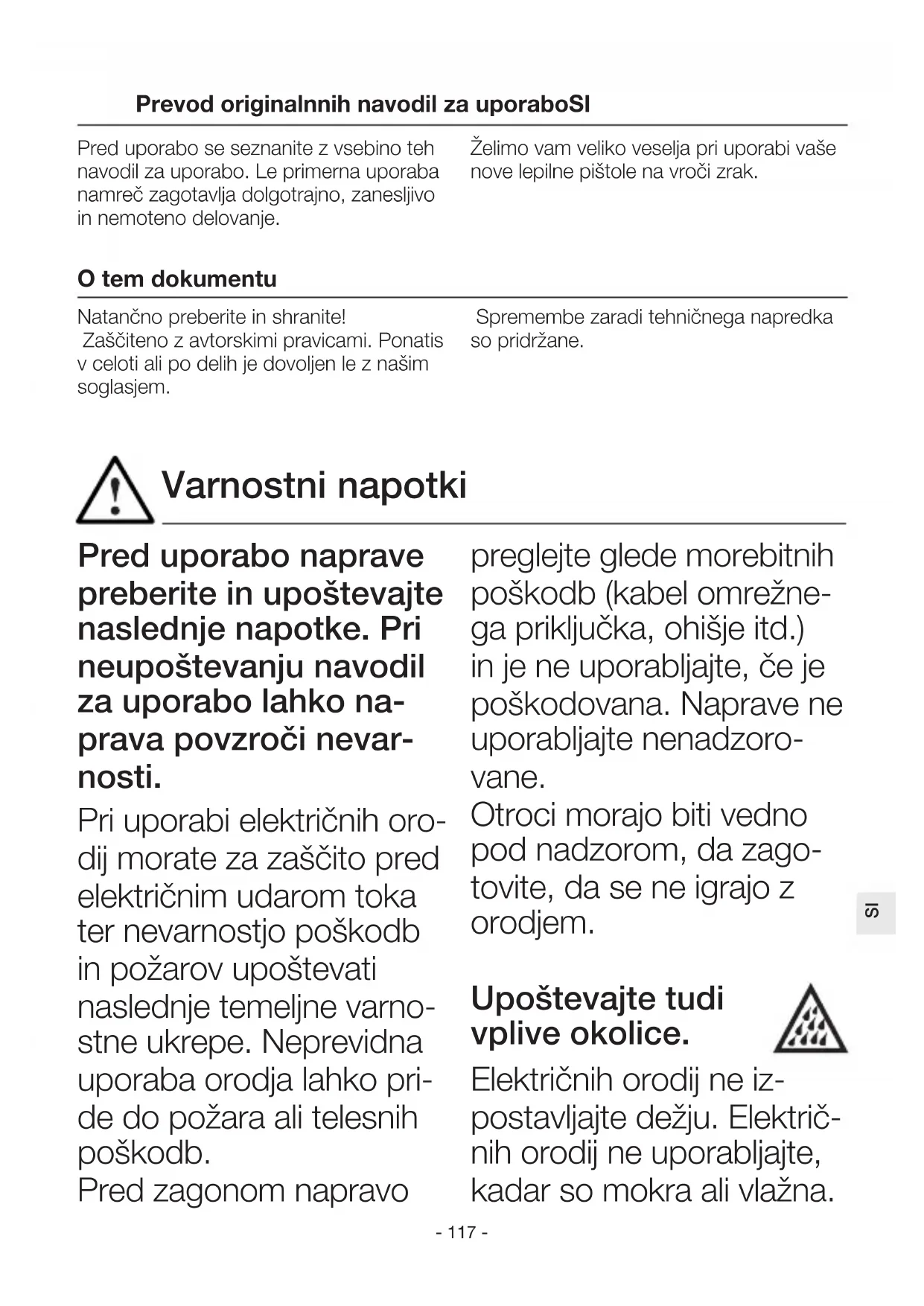 Pred uporabo naprave preberite in upoštevajte naslednje napotke. Pri neupoštevanju navodil za uporabo lahko na- prava povzroči nevar- nosti. Pri uporabi električnih oro- dij morate za zaščito pred električnim udarom toka ter nevarnostjo poškodb in požarov upoštevati naslednje temeljne varno- stne ukrepe. Neprevidna uporaba orodja lahko pri- de do požara ali telesnih poškodb. Pred zagonom napravo preglejte glede morebitnih poškodb (kabel omrežne- ga priključka, ohišje itd.) in je ne uporabljajte, če je poškodovana. Naprave ne uporabljajte nenadzoro- vane. Otroci morajo biti vedno pod nadzorom, da zago- tovite, da se ne igrajo z orodjem. Upoštevajte tudi vplive okolice. Električnih orodij ne iz- postavljajte dežju. Električ- nih orodij ne uporabljajte, kadar so mokra ali vlažna. Pred uporabo se seznanite z vsebino teh navodil za uporabo. Le primerna uporaba namreč zagotavlja dolgotrajno, zanesljivo in nemoteno delovanje. Želimo vam veliko veselja pri uporabi vaše nove lepilne pištole na vroči zrak. O tem dokumentu Natančno preberite in shranite! Zaščiteno z avtorskimi pravicami. Ponatis v celoti ali po delih je dovoljen le z našim soglasjem. Spremembe zaradi tehničnega napredka so pridržane. Varnostni napotki Prevod originalnnih navodil za uporaboSI- 118 - Prav tako jih ne uporabljaj- te v mokrem ali vlažnem okolju. Previdno pri upora- bi naprav v bližini gorljivih materialov. Ne usmerjajte za dlje časa na eno in isto mesto. Naprave ne uporabljajte v potencialno eksplozivnih ozračjih. Iz- stopajoča toplota se lahko prevaja do gorljivih materi- alov, ki so zakriti. Zaščitite se pred električnim udarom. Izogibajte se dotikov tele- sa z ozemljenimi deli, na primer cevmi, radiatorji, pečmi, hladilniki. Dokler je vklopljena, naprave nikoli ne puščajte nenadzoro- vane. Vaša orodja vedno hranite na varnem mestu. Napravo po uporabi po- stavite na stojno površino in pustite, da se ohladi, preden jo boste shranili. Orodje, ki ga ne uporab- ljate, shranjujte v suhem in zaprtem prostoru ter nedosegljivo otrokom. To napravo lahko otroci, starejši kot 8 let, in osebe z zmanjšanimi fizičnimi, senzoričnimi ali mentalni- mi sposobnostmi ali brez izkušenj in znanja upora- bljajo le, če so pod nadzo- rom ali če so bili poučeni o varni uporabi naprave in razumejo nevarnosti, ki izvirajo iz uporabe. Otroci se z napravo ne smejo igrati. Čiščenja in vzdrževanja, ki ga opravlja uporabnik, ot- roci ne smejo izvajati brez nadzora. Ne preobremenjujte svojih orodij. Bolje in bolj varno boste delali v navedenem ob- Varnostni napotki- 119 -