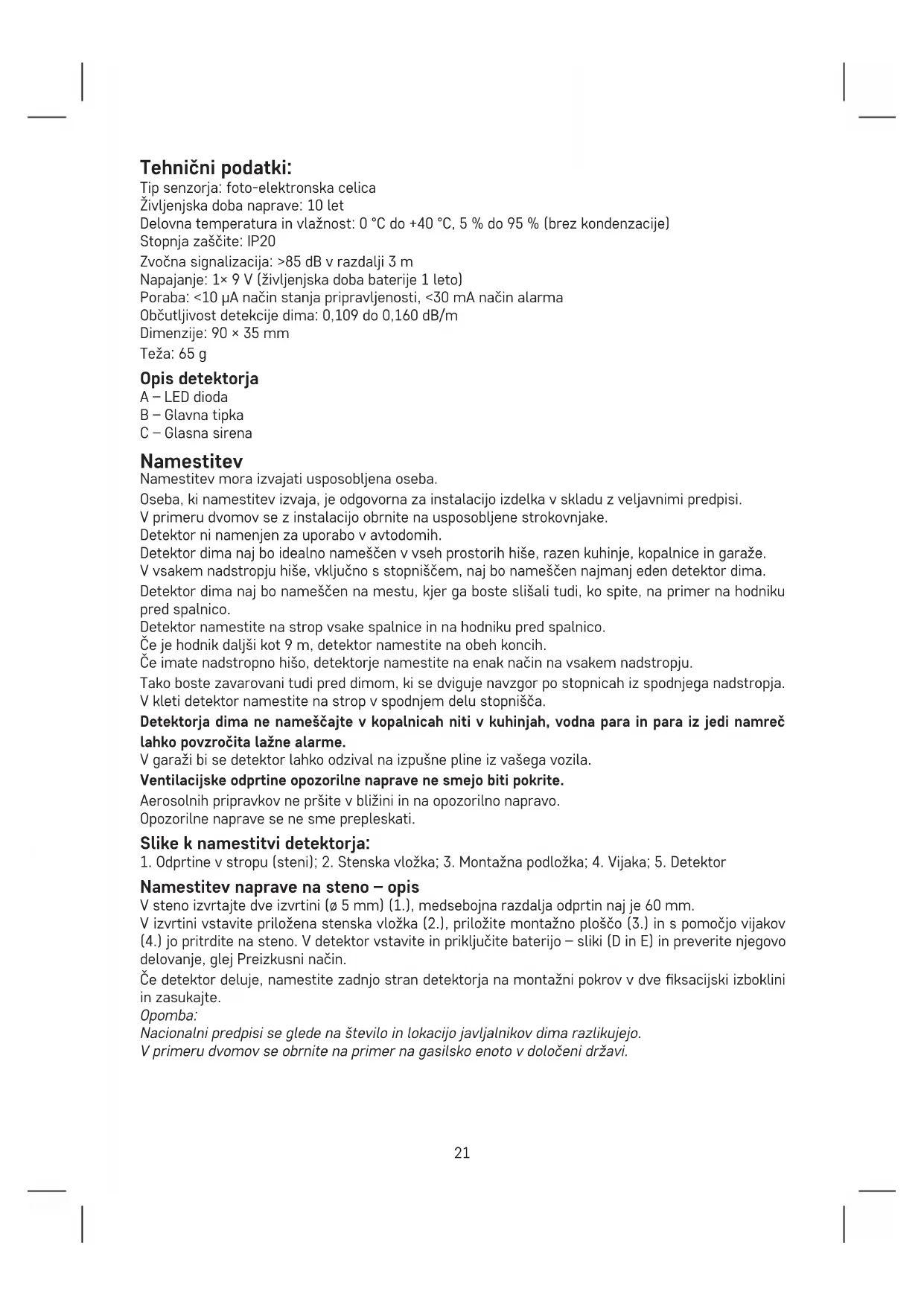 Gyártóüzem: Siterwell Electronics CO., limited No.666 Qing- feng Road, Jiangbei District, Ningbo, Zhejiang Province, China SI | Detektor dima Navodila vsebujejo pomembne varnosten informacije o namestitvi in delovanju detektorja. Navodila natančno preberite in jih shranite za potrebe v prihodnje. Z upravljanjem detektorja seznanite tudi vse ostale stanovalce v stavbi. Izdelajte evakuacijski načrt za primer požara in ga vsak mesec vadite. Vsi stanovalci v stavbi naj se s signali detektorja seznanijo, da se na njih znajo nemudoma odzvati. Detektor omogoča odkriti počasno tleči plamen, ki ga spremlja gost črn dim in lahko traja nekaj ur, preden se spremeni v velik požar. Opozorilo: Če pri vas potekajo gradbena dela, pri katerih se praši, bi mogli detektor dima odstraniti z montažne plošče, da ne pride do poškodbe le-tega. Če to iz kakšnega razloga ni možno, je treba odprtine de- tektorja po čas del pokriti npr. s plastično vrečko. Pokrit detektor ne bo zaznal požara niti dima, torej ga vsak dan po končanem delu odkrijte.21 Tehnični podatki: Tip senzorja: foto-elektronska celica Življenjska doba naprave: 10 let Delovna temperatura in vlažnost: 0 °C do +40 °C, 5% do 95% (brez kondenzacije) Stopnja zaščite: IP20 Zvočna signalizacija: >85 dB v razdalji 3 m Napajanje: 1× 9 V (življenjska doba baterije 1 leto) Poraba: <10 μA način stanja pripravljenosti, <30 mA način alarma Občutljivost detekcije dima: 0,109 do 0,160 dB/m Dimenzije: 90 × 35 mm Teža: 65 g Opis detektorja A – LED dioda B – Glavna tipka C – Glasna sirena Namestitev Namestitev mora izvajati usposobljena oseba. Oseba, ki namestitev izvaja, je odgovorna za instalacijo izdelka v skladu z veljavnimi predpisi. V primeru dvomov se z instalacijo obrnite na usposobljene strokovnjake. Detektor ni namenjen za uporabo v avtodomih. Detektor dima naj bo idealno nameščen v vseh prostorih hiše, razen kuhinje, kopalnice in garaže. V vsakem nadstropju hiše, vključno s stopniščem, naj bo nameščen najmanj eden detektor dima. Detektor dima naj bo nameščen na mestu, kjer ga boste slišali tudi, ko spite, na primer na hodniku pred spalnico. Detektor namestite na strop vsake spalnice in na hodniku pred spalnico. Če je hodnik daljši kot 9 m, detektor namestite na obeh koncih. Če imate nadstropno hišo, detektorje namestite na enak način na vsakem nadstropju. Tako boste zavarovani tudi pred dimom, ki se dviguje navzgor po stopnicah iz spodnjega nadstropja. V kleti detektor namestite na strop v spodnjem delu stopnišča. Detektorja dima ne nameščajte v kopalnicah niti v kuhinjah, vodna para in para iz jedi namreč lahko povzročita lažne alarme. V garaži bi se detektor lahko odzival na izpušne pline iz vašega vozila. Ventilacijske odprtine opozorilne naprave ne smejo biti pokrite. Aerosolnih pripravkov ne pršite v bližini in na opozorilno napravo. Opozorilne naprave se ne sme prepleskati. Slike k namestitvi detektorja: