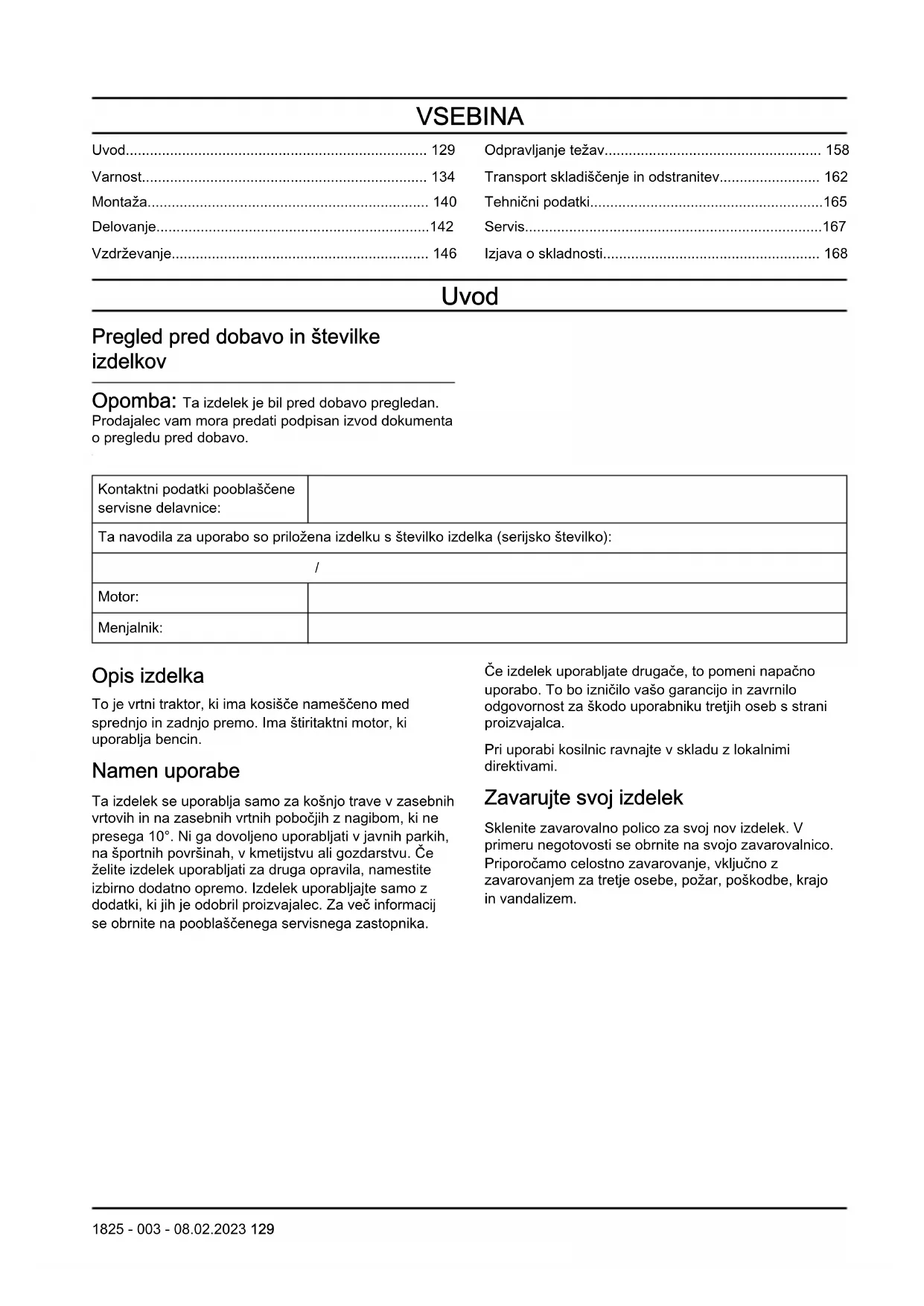 Motor: Menjalnik: Opis izdelka To je vrtni traktor, ki ima kosišče nameščeno med sprednjo in zadnjo premo. Ima štiritaktni motor, ki uporablja bencin. Namen uporabe Ta izdelek se uporablja samo za košnjo trave v zasebnih vrtovih in na zasebnih vrtnih pobočjih z nagibom, ki ne presega 10°. Ni ga dovoljeno uporabljati v javnih parkih, na športnih površinah, v kmetijstvu ali gozdarstvu. Če želite izdelek uporabljati za druga opravila, namestite izbirno dodatno opremo. Izdelek uporabljajte samo z dodatki, ki jih je odobril proizvajalec. Za več informacij se obrnite na pooblaščenega servisnega zastopnika. Če izdelek uporabljate drugače, to pomeni napačno uporabo. To bo izničilo vašo garancijo in zavrnilo odgovornost za škodo uporabniku tretjih oseb s strani proizvajalca. Pri uporabi kosilnic ravnajte v skladu z lokalnimi direktivami. Zavarujte svoj izdelek Sklenite zavarovalno polico za svoj nov izdelek. V primeru negotovosti se obrnite na svojo zavarovalnico. Priporočamo celostno zavarovanje, vključno z zavarovanjem za tretje osebe, požar, poškodbe, krajo in vandalizem. 1825 - 003 - 08.02.2023 129Pregled izdelka Pregled izdelka (TS 112)