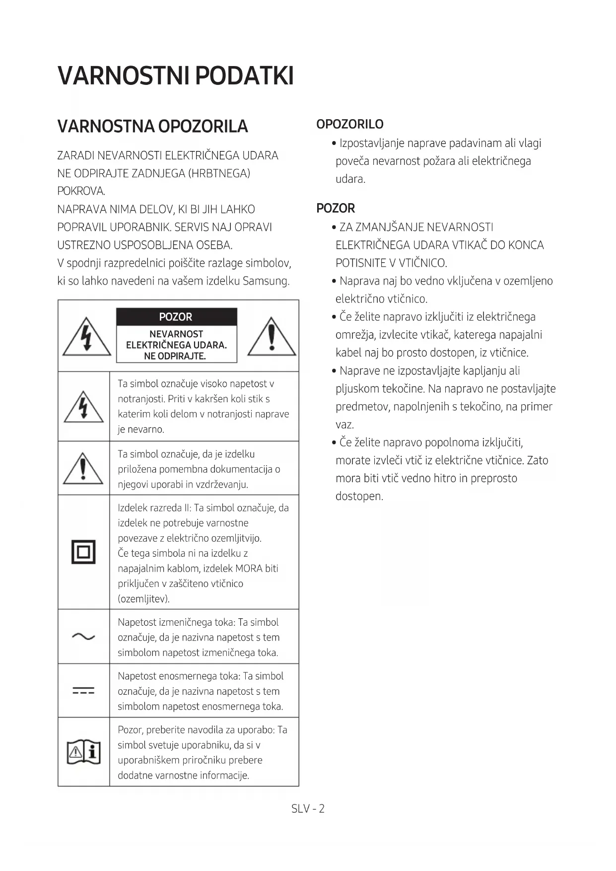 USTREZNO USPOSOBLJENA OSEBA. V spodnji razpredelnici poiščite razlage simbolov, ki so lahko navedeni na vašem izdelku Samsung. POZOR NEVARNOST ELEKTRIČNEGA UDARA. NE ODPIRAJTE.Ta simbol označuje visoko napetost v notranjosti. Priti v kakršen koli stik s katerim koli delom v notranjosti naprave je nevarno.Ta simbol označuje, da je izdelku priložena pomembna dokumentacija o njegovi uporabi in vzdrževanju.Izdelek razreda II: Ta simbol označuje, da izdelek ne potrebuje varnostne povezave z električno ozemljitvijo. Če tega simbola ni na izdelku z napajalnim kablom, izdelek MORA biti priključen v zaščiteno vtičnico (ozemljitev). Napetost izmeničnega toka: Ta simbol označuje, da je nazivna napetost s tem simbolom napetost izmeničnega toka.Napetost enosmernega toka: Ta simbol označuje, da je nazivna napetost s tem simbolom napetost enosmernega toka.Pozor, preberite navodila za uporabo: Ta simbol svetuje uporabniku, da si v uporabniškem priročniku prebere dodatne varnostne informacije. OPOZORILO