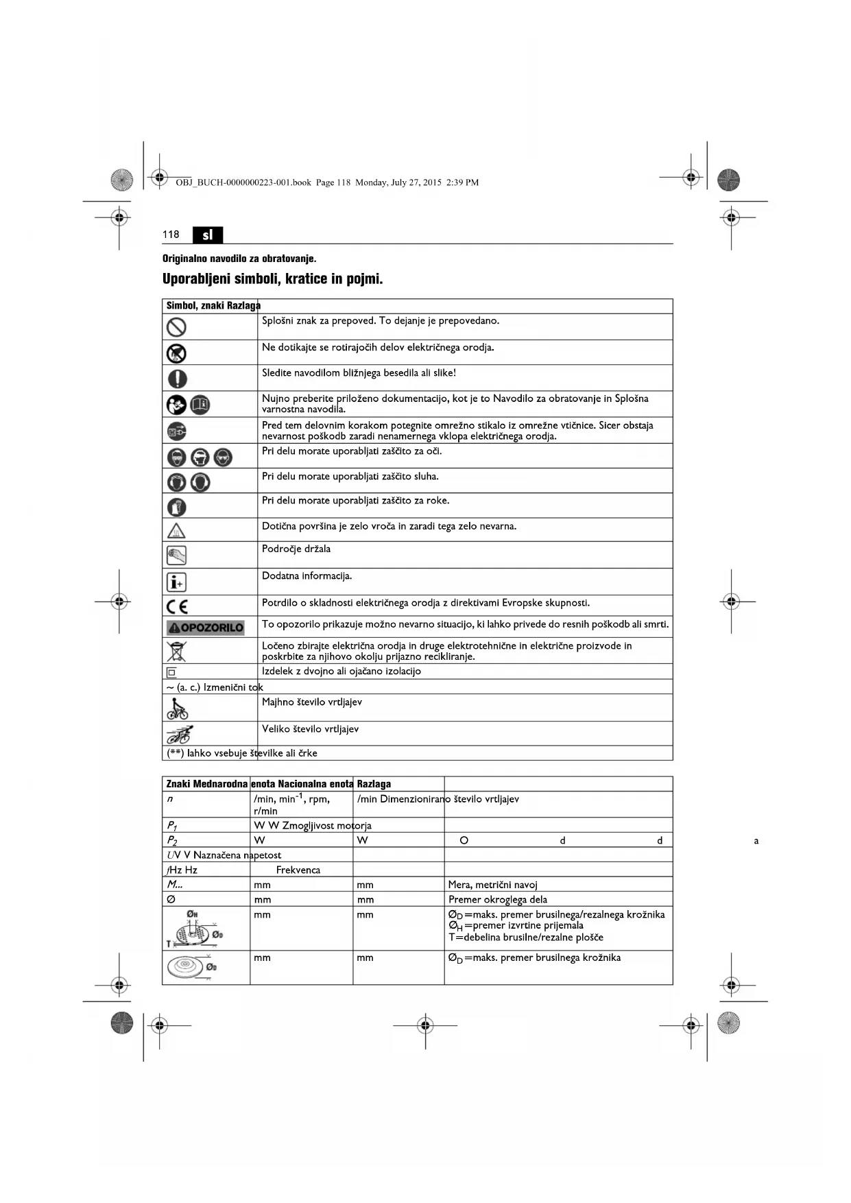 Originalno navodilo za obratovanje. Uporabljeni simboli, kratice in pojmi. Simbol, znaki Razlaga Splošni znak za prepoved. To dejanje je prepovedano. Ne dotikajte se rotirajočih delov električnega orodja. Sledite navodilom bližnjega besedila ali slike! Nujno preberite priloženo dokumentacijo, kot je to Navodilo za obratovanje in Splošna varnostna navodila. Pred tem delovnim korakom potegnite omrežno stikalo iz omrežne vtičnice. Sicer obstaja nevarnost poškodb zaradi nenamernega vklopa električnega orodja. Pri delu morate uporabljati zaščito za oči. Pri delu morate uporabljati zaščito sluha. Pri delu morate uporabljati zaščito za roke. Dotična površina je zelo vroča in zaradi tega zelo nevarna. Področje držala Dodatna informacija. Potrdilo o skladnosti električnega orodja z direktivami Evropske skupnosti. To opozorilo prikazuje možno nevarno situacijo, ki lahko privede do resnih poškodb ali smrti. Ločeno zbirajte električna orodja in druge elektrotehnične in električne proizvode in poskrbite za njihovo okolju prijazno recikliranje. Izdelek z dvojno ali ojačano izolacijo ~ (a. c.) Izmenični tok Majhno število vrtljajev Veliko število vrtljajev (**) lahko vsebuje številke ali črke Znaki Mednarodna enota Nacionalna enota Razlaga