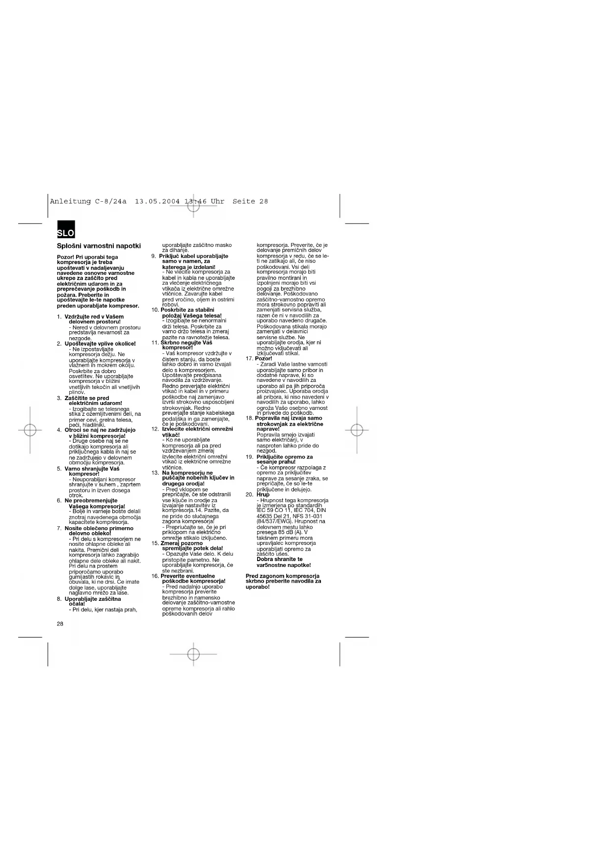 Anleitung C-8/24a 13.05.2004 13:46 Uhr Seite 2728 Splošni varnostni napotki Pozor! Pri uporabi tega kompresorja je treba upoštevati v nadaljevanju navedene osnovne varnostne ukrepe za zaščito pred električnim udarom in za preprečevanje poškodb in požara. Preberite in upoštevajte le-te napotke preden uporabljate kompresor.