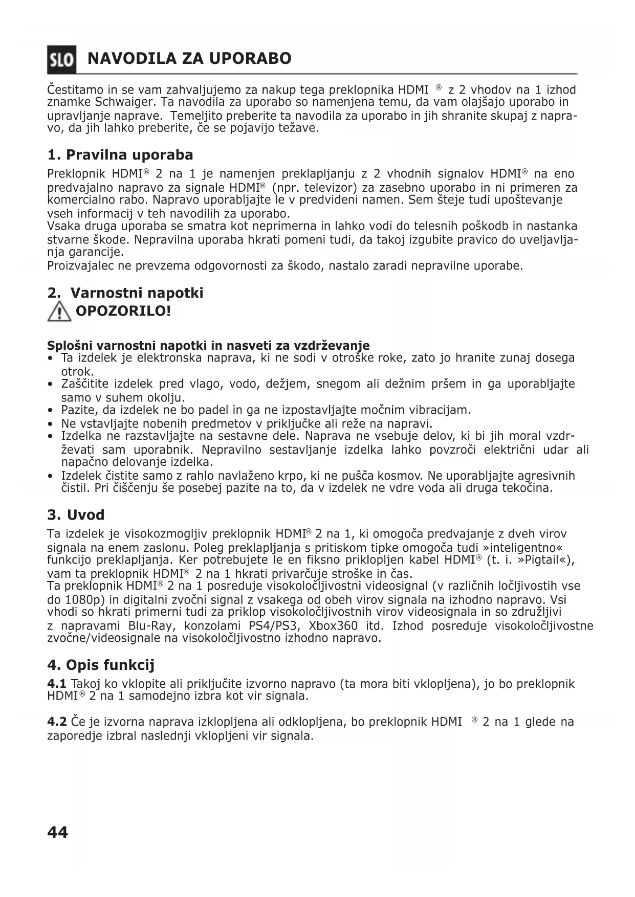 z 2 vhodov na 1 izhod znamke Schwaiger. Ta navodila za uporabo so namenjena temu, da vam olajšajo uporabo in upravljanje naprave. Temeljito preberite ta navodila za uporabo in jih shranite skupaj z napra- vo, da jih lahko preberite, če se pojavijo težave.