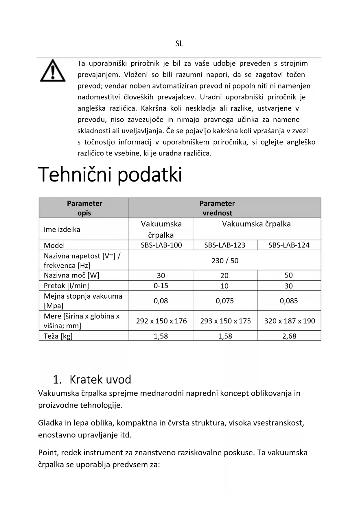 Ta uporabniški priročnik je bil za vaše udobje preveden s strojnim prevajanjem. Vloženi so bili razumni napori, da se zagotovi točen prevod; vendar noben avtomatiziran prevod ni popoln niti ni namenjen nadomestitvi človeških prevajalcev. Uradni uporabniški priročnik je angleška različica. Kakršna koli neskladja ali razlike, ustvarjene v prevodu, niso zavezujoče in nimajo pravnega učinka za namene skladnosti ali uveljavljanja. Če se pojavijo kakršna koli vprašanja v zvezi s točnostjo informacij v uporabniškem priročniku, si oglejte angleško različico te vsebine, ki je uradna različica. Tehnični podatki Parameter opis Parameter vrednost Ime izdelka Vakuumska črpalka Vakuumska črpalka Model SBS-LAB-100 SBS-LAB-123 SBS-LAB-124 Nazivna napetost [V~] / frekvenca [Hz] 230 / 50 Nazivna moč [W]