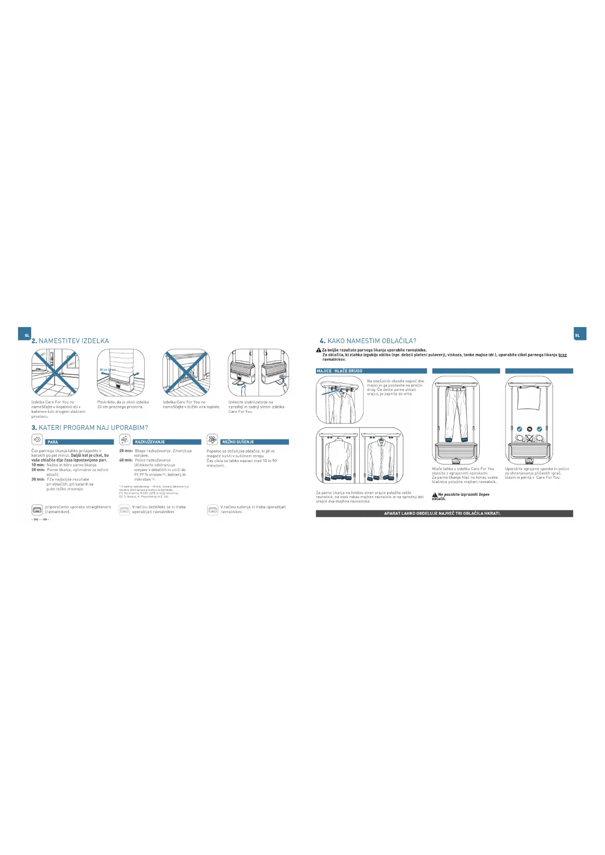 PARA Čas parnega likanja lahko prilagodite v korakih po pet minut. Daljši kot je cikel, bo vaše oblačilo dlje časa izpostavljeno pari. 10 min: Nežno in hitro parno likanje. 20 min: Parno likanje, optimalno za večino oblačil. 30 min: FZa najboljše rezultate pri oblačilih, pri katerih se gube težko zravnajo. RAZKUŽEVANJE 20 min: Blago razkuževanje. Zmanjšuje vonjave. 40 min: Polno razkuževanje. Učinkovito odstranjuje vonjave v oblačilih in uniči do 99,99 % virusov (1) , bakterij in mikrobov (2)
