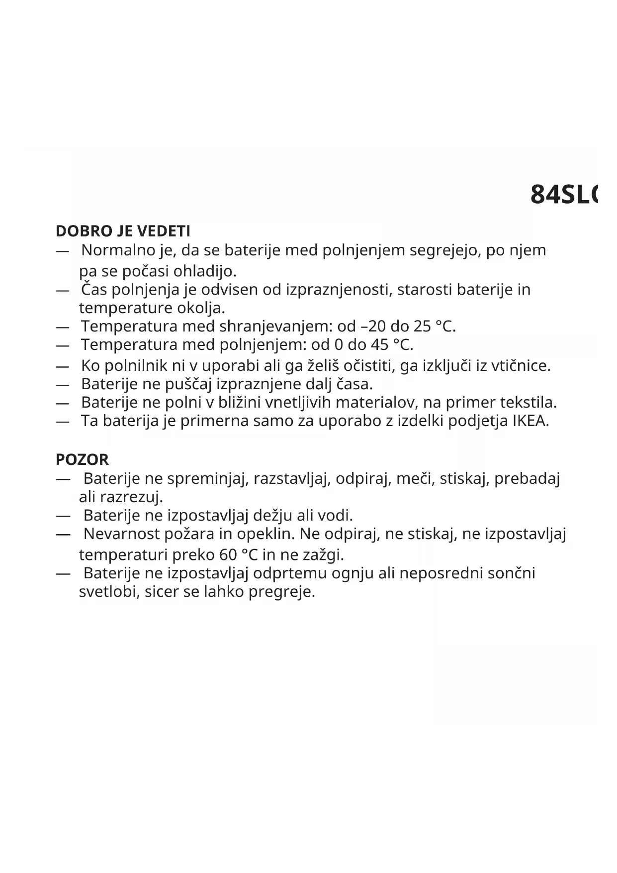 — Normalno je, da se baterije med polnjenjem segrejejo, po njem pa se počasi ohladijo. — Čas polnjenja je odvisen od izpraznjenosti, starosti baterije in temperature okolja. — Temperatura med shranjevanjem: od –20 do 25 °C. — Temperatura med polnjenjem: od 0 do 45 °C. — Ko polnilnik ni v uporabi ali ga želiš očistiti, ga izključi iz vtičnice. — Baterije ne puščaj izpraznjene dalj časa. — Baterije ne polni v bližini vnetljivih materialov, na primer tekstila. — Ta baterija je primerna samo za uporabo z izdelki podjetja IKEA. POZOR — Baterije ne spreminjaj, razstavljaj, odpiraj, meči, stiskaj, prebadaj ali razrezuj. — Baterije ne izpostavljaj dežju ali vodi. — Nevarnost požara in opeklin. Ne odpiraj, ne stiskaj, ne izpostavljaj temperaturi preko 60 °C in ne zažgi. — Baterije ne izpostavljaj odprtemu ognju ali neposredni sončni svetlobi, sicer se lahko pregreje.85 — Baterije ne uporabljaj v bližini visokonapetostnih naprav. — Ta izdelek ni igrača. Shranjuj izven dosega otrok. Poskrbi, da bodo vsi uporabniki izdelka prebrali in upoštevali ta navodila in opozorila. — Na bateriji ne povzročaj kratkega stika. — Če pride do izlitja baterije, prepreči stik tekočine s kožo ali z očmi.